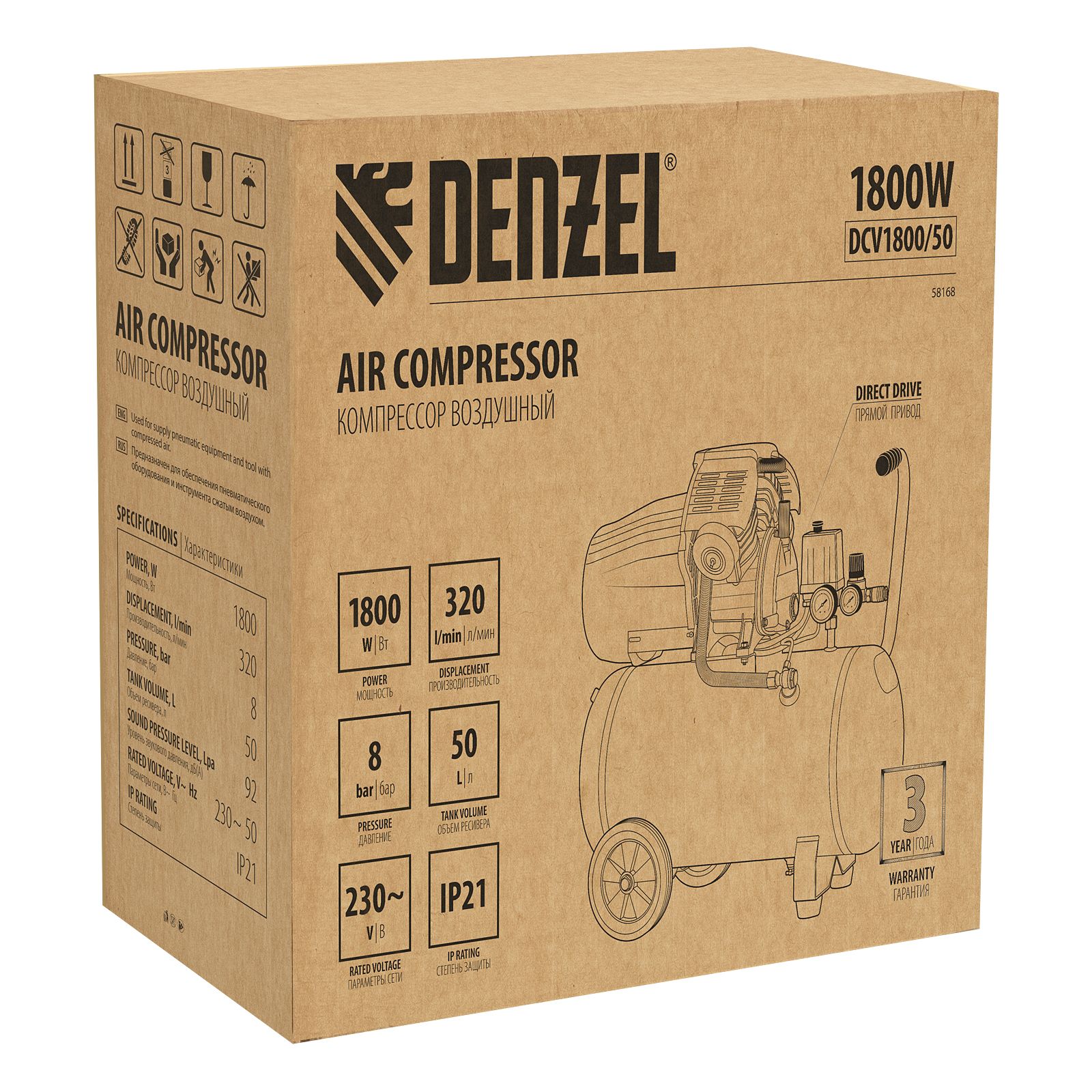 Воздушный компрессор с прямым приводом Denzel DCV1800/50 58168 мощностью 1,8 кВт и производительностью на входе 320 л/мин, с объемом ресивера 50 л, подходит для обеспечения длительной работы пневмогайковерта, пневмозубила, пневмодрели, пневмомолотка или другого пневмоинструмента. Быстроразъемные коннекторы Рапид (Евро) облегчают подключение пневмомагистралей. Эффективная система смазки снижает износ деталей и уменьшает нагрузку на двигатель, что позволяет использовать компрессор в профессиональной сфере.