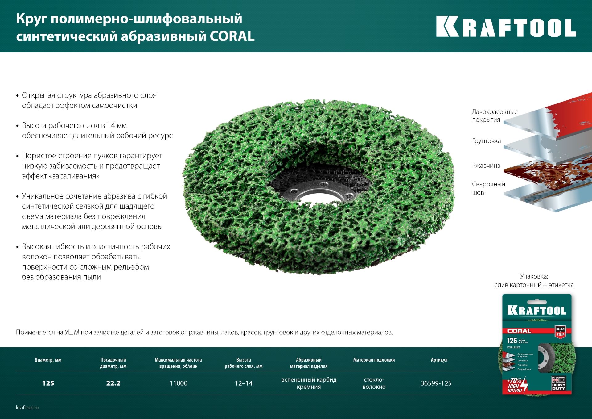 Синтетические полимерно-шлифовальные круги KRAFTOOL обладают максимально возможной производительностью при зачистке металла и древисины от ржавчины, засторелых лакокрасочных покрытий, грунтовок и других отделочных материалов.