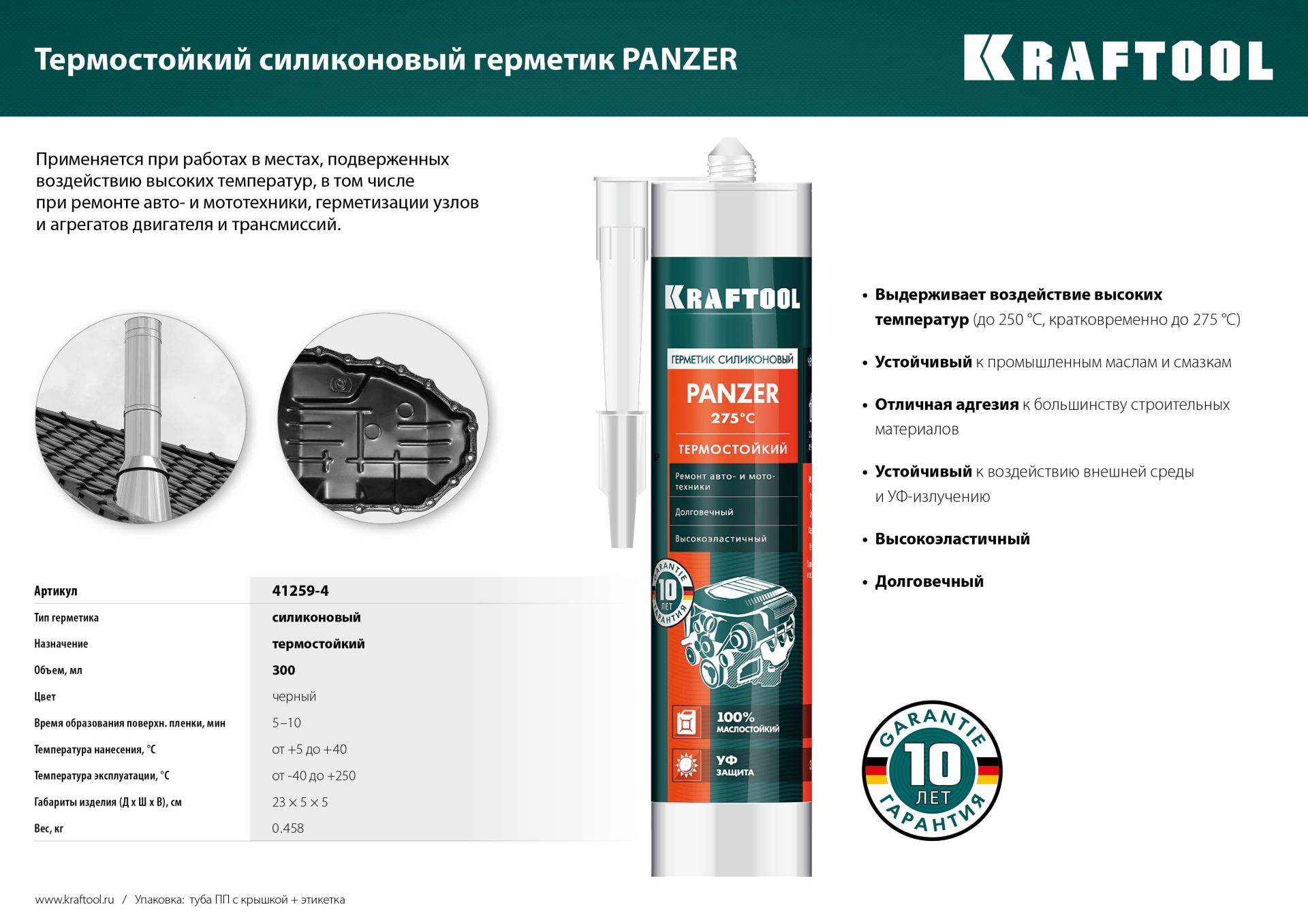 Температуростойкий герметик силиконовый 300мл Kraftool 41259-4 - долговечный термостойкий силиконовый материал широкого спектра применения для выполнения профессиональных монтажных работ, например: герметизации соединений, подвергающихся воздействию высоких температур, в автомобильных и промышленных двигателях, в насосах, коробках переключения передач, компрессорах, вентиляционных системах, печах, каминах и многом другом. Состав идеален при использовании в подвижных швах. Герметик быстро затвердевает под действием влажности воздуха, обладает высокой эластичностью и адгезией к большинству материалов (металлы, стекло, древесина, керамика, пластик, окрашенные поверхности). Отличается устойчивостью к влаге, атмосферным воздействиям и химическим веществам. Температура нанесения: от +5 до +40 °С, температура эксплуатации: от -65 до +315 °С.
