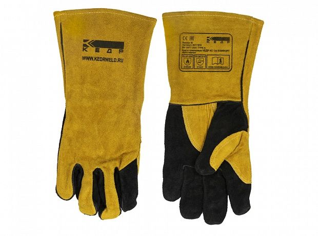 Краги сварочные КЕДP КС-16 КОМФОРТ (L), желто-черные обеспечивают максимальный комфорт и надежную защиту от брызг и ожогов.