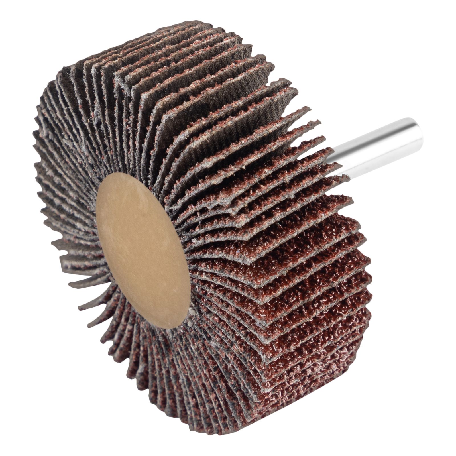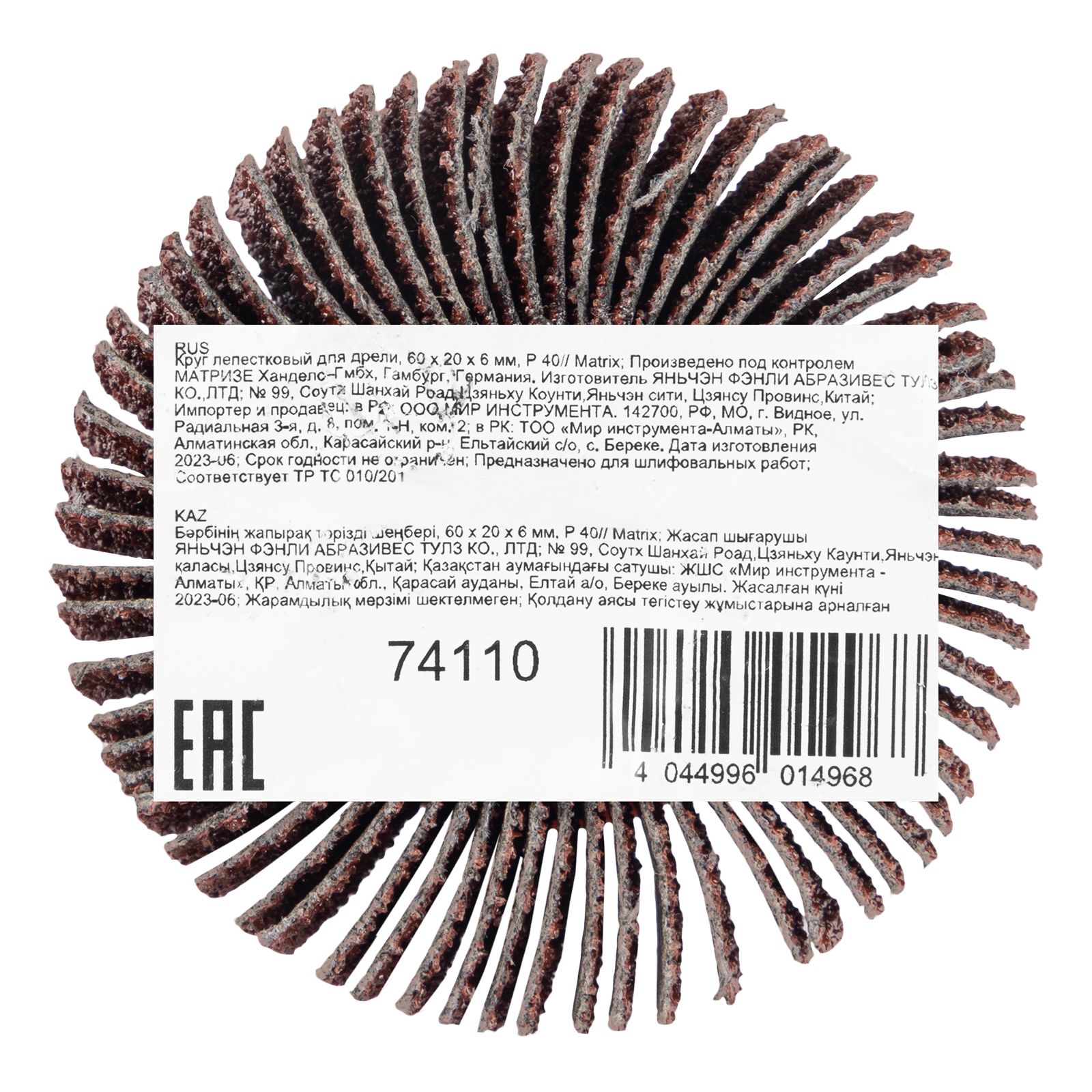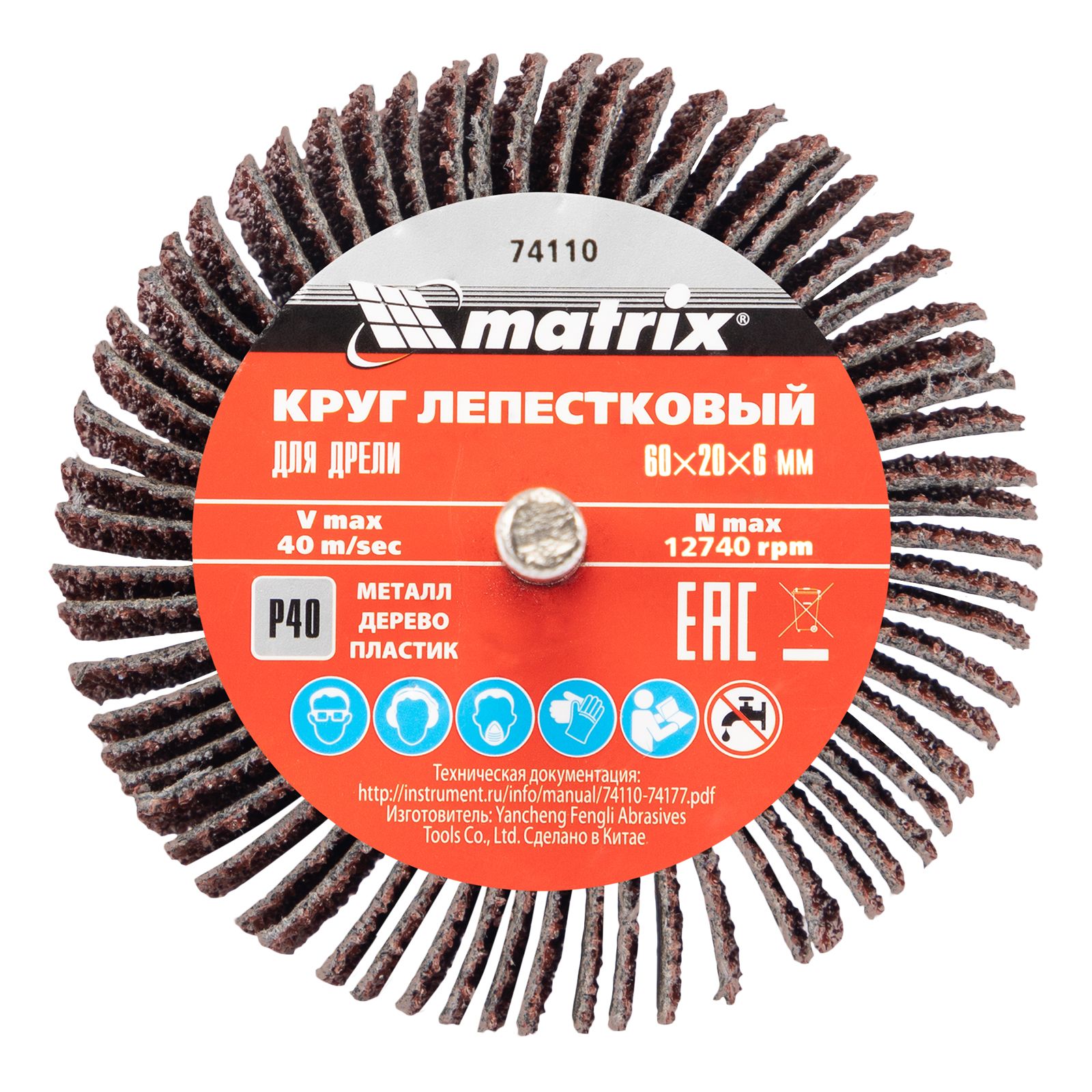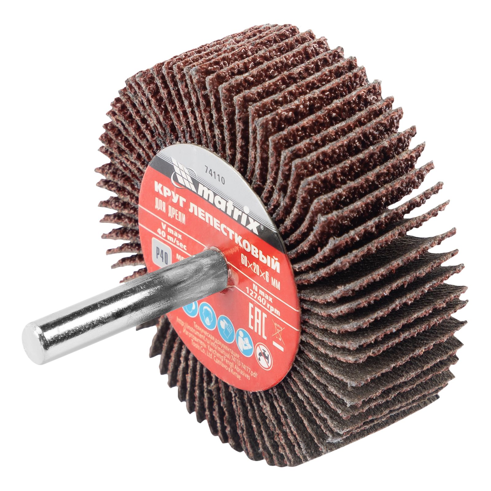 Лепестковый круг Matrix 74110 размером 60 х 20 х 6 мм, с зернистостью P 40, — оснастка для дрелей и прямых шлифовальных машинок с посадочным гнездом 6 мм, рассчитанная на скорость до 8000 об/мин. Круг применяется для грубой обработки древесины, металла и других материалов. Крупнозернистый абразив P 40 эффективно снимает толстые слои краски и ржавчины, зачищает сварные швы, удаляет заусенцы.