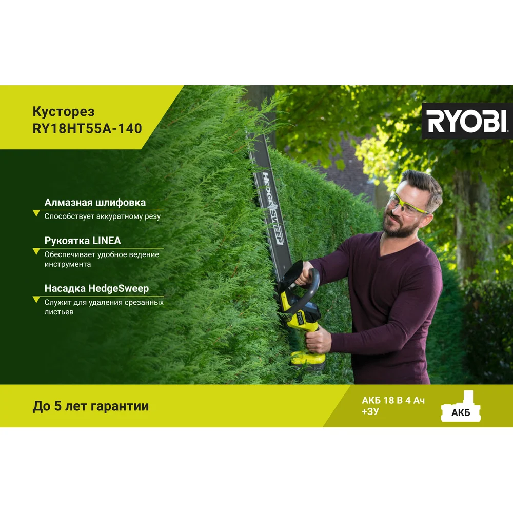 Кусторез Ryobi ONE+ 18В RY18HT55A-140 5133005499 используется для ухода за садовыми изгородями. Новая конструкция рукояти LINEA сочетает в одном идеально сбалансированном корпусе комфорт, компактный дизайн и простоту использования. Лезвие длинной 55 см с шагом 24 мм позволяет срезать даже толстые ветви. Лезвие, заточенное алмазной шлифовкой, обеспечивает чистый и аккуратный рез.