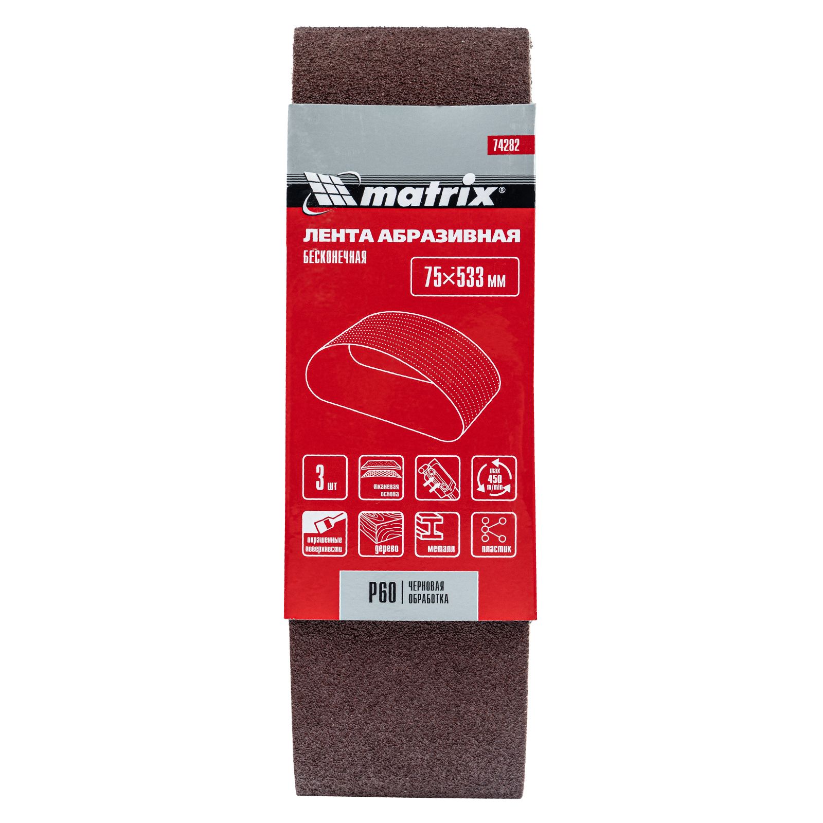 Абразивная лента Matrix 74282 зернистостью P 60 поставляется в наборе из 3 шт. и используется на ленточных шлифовальных машинах, совместимых со сменными элементами размером 75 х 533 мм. Применяется для черновой обработки деревянных, пластиковых и металлических поверхностей. Подходит для снятия лака, краски, ржавчины, заусенцев и т.д.