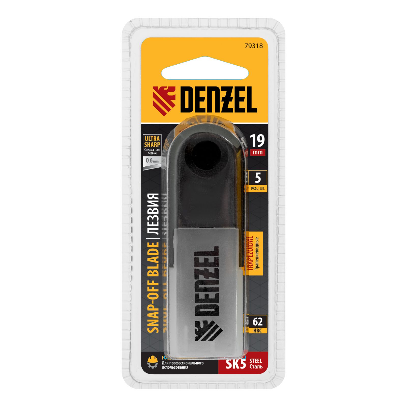 Трапециевидные лезвия Denzel 79318 шириной 19 мм, изготовленные из стали SK5 толщиной 0,6 мм, 5 шт. в упаковке, — сменные элементы для строительных ножей. Подходят для разрезания линолеума, картона, пластика, гипсокартона, раскройки обоев. Отличаются повышенной прочностью и долговечностью по сравнению с аналогами других торговых марок. Сменные полотна используются в профессиональной и бытовой сфере.
