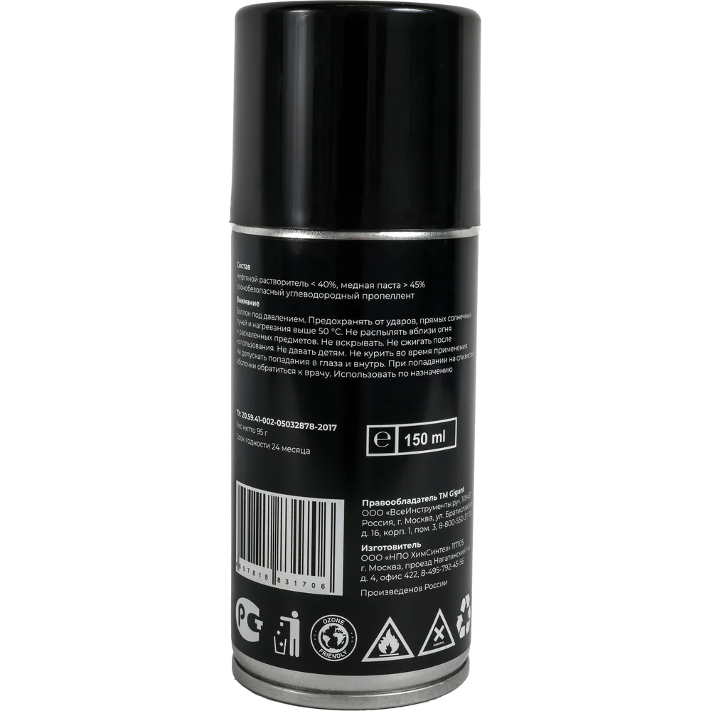 Медная смазка Gigant 210мл GLM-210 используется для обработки резьбовых соединений и деталей, подвергающихся экстремальным температурам и давлению. Продукт предотвращает коррозийное прикипание и холодное сваривание контактирующих элементов. Смазка отличается высокой стойкостью к воздействию атмосферных осадков и дорожных реагентов, является термостойкой. Эффективно работает в широком температурном диапазоне – от -30 ºС до +1100 ºС.