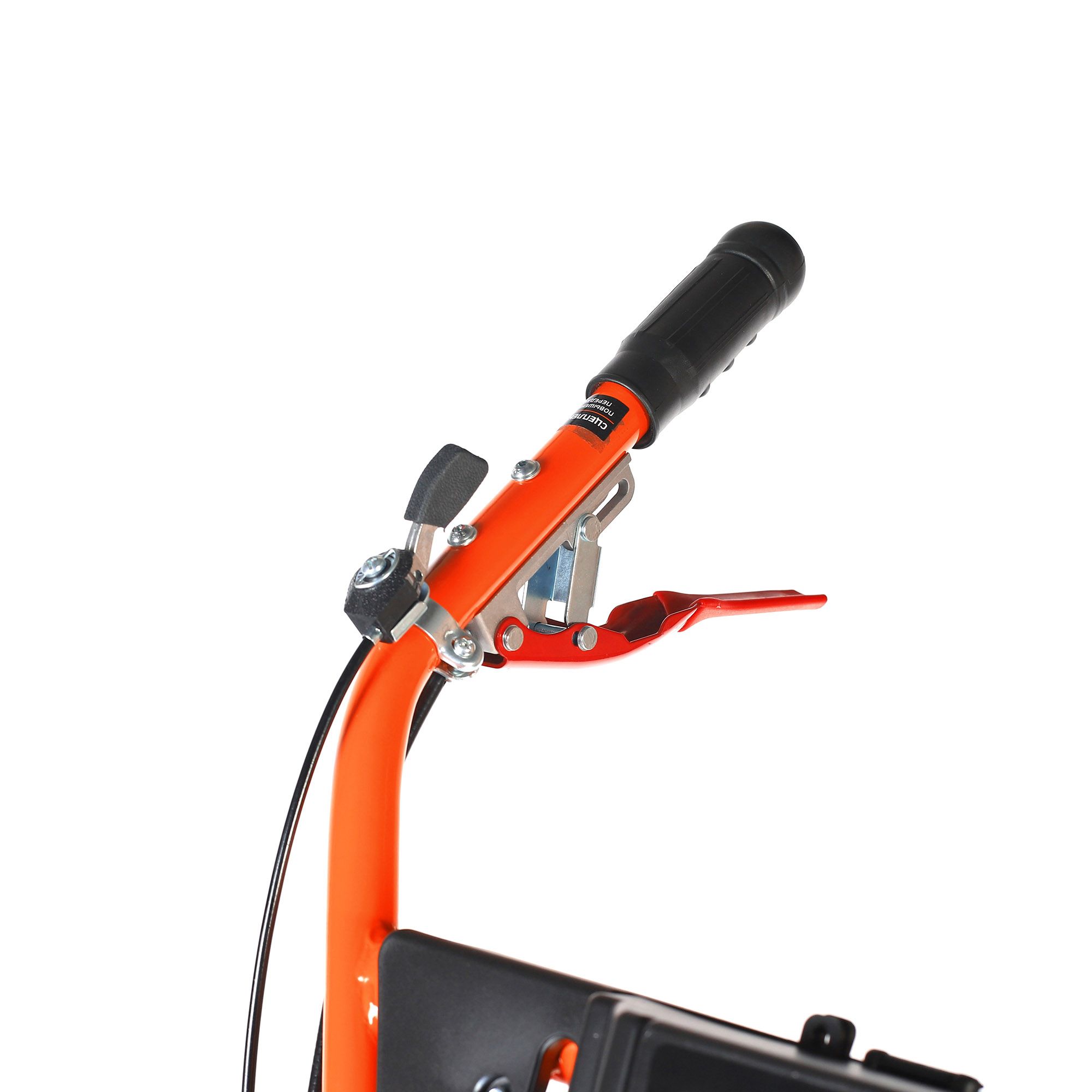 Урал М - бензиновый мотоблок повышенного ресурса с пониженной передачей и цельнолитым чугунным цепным редуктором. Конструкция рамы облегчает транспортировку мотоблока и защищает четырехтактный двигатель. Переключение скоростей осуществляется с помощью 6-и ступенчатой коробки передач с пониженной и повышенной передачами. На универсальную сцепку можно установить навесное оборудование или тележку. В комплекте закаленные фрезы, широкие колеса с глубоким протектором, сошник. Кнопка включения, рукоятка газа и рычаг привода расположены на руле. Наклон руля регулируется.