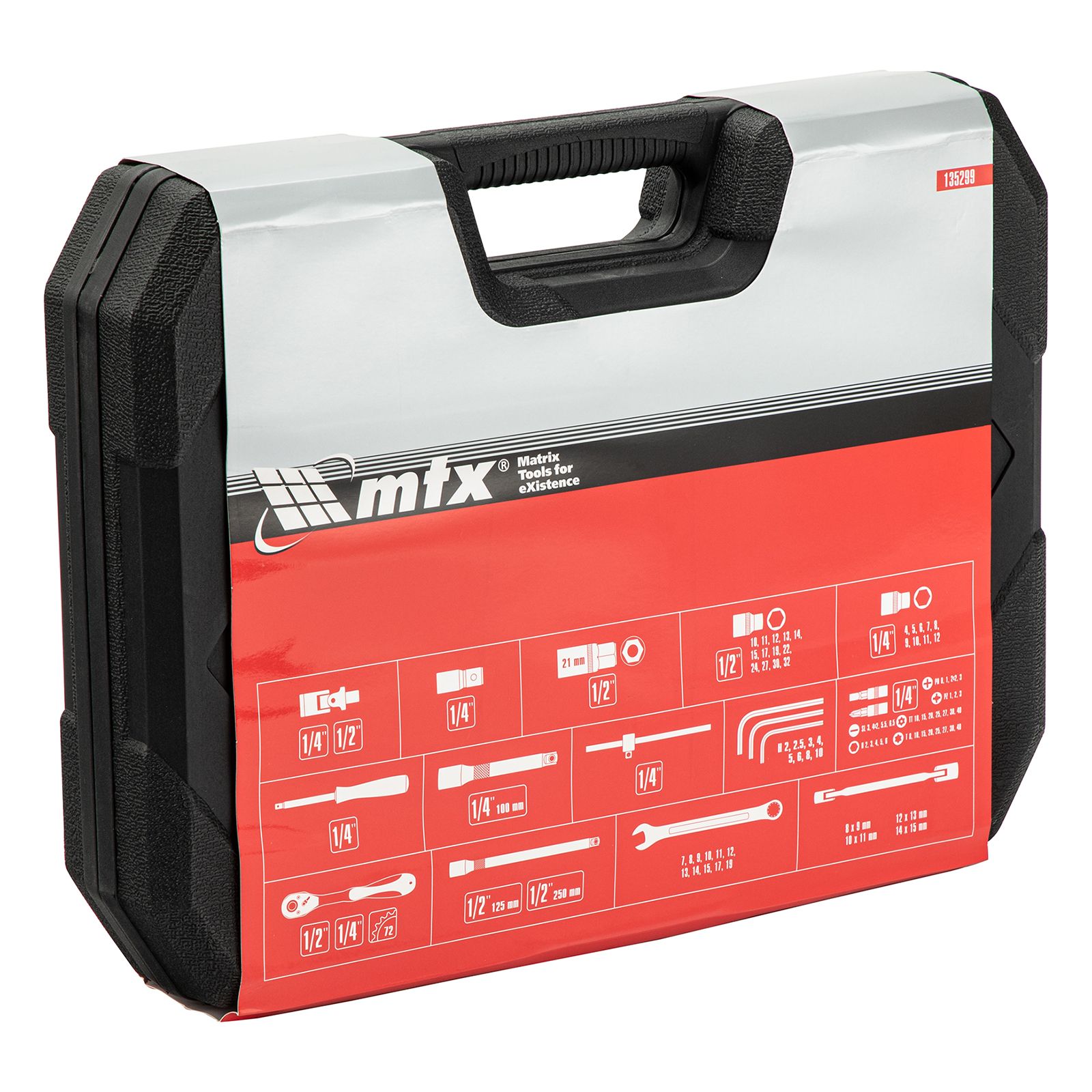 Набор инструментов MTX 135289 состоит из 89 предметов с присоединительными квадратами 1/2″ и 1/4″. Инструменты предназначены для монтажа и демонтажа резьбового крепежа с разными типами шлицев. В комплект поставки входит кардан, удлинители и шарнирные ключи, облегчающие работу в труднодоступных местах. Набор используется для ремонта автомобилей, пригодится также в быту.