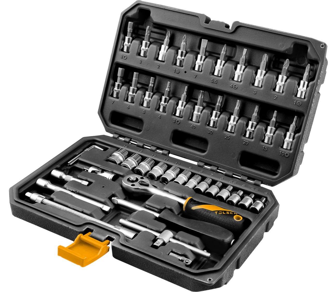 Материалы – сталь Cr-V, сталь S2 (биты), конструкционная сталь, хром, пластик PP, PP+TPR (рукояти), пластик PE-HD (кейс)