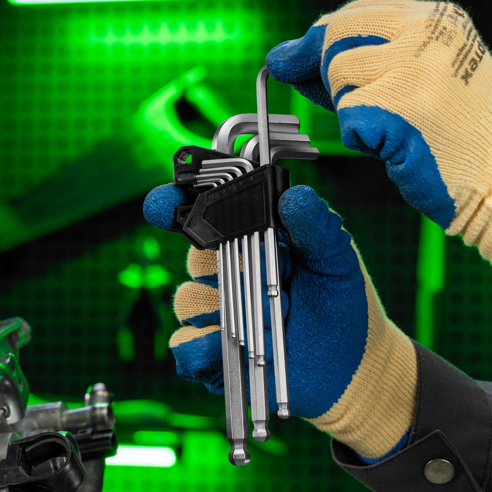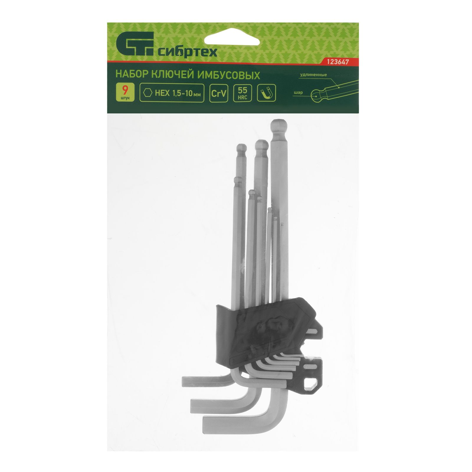 Набор Сибртех 123647 включает в себя 9 удлиненных имбусовых ключей из стали CrV размером 1,5-10 мм, с шаром, предназначенных для закручивания и откручивания крепежа со шлицем типа HEX. Шарообразные наконечники можно вставлять в головку крепежа под углом до 25°, удлиненные профили позволяют увеличить прикладываемое усилие. Набор пригодится для ремонта велосипедов, сборки мебели, установки и регулировки пластиковых окон.