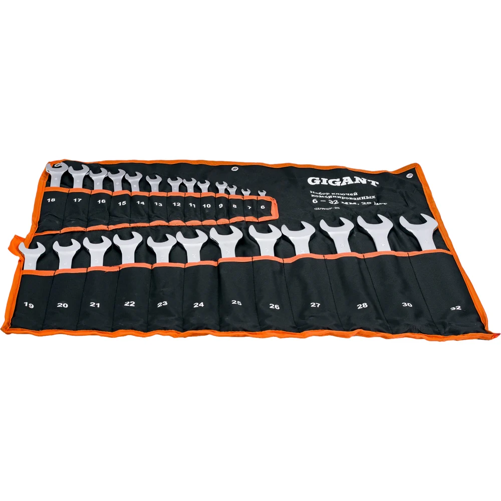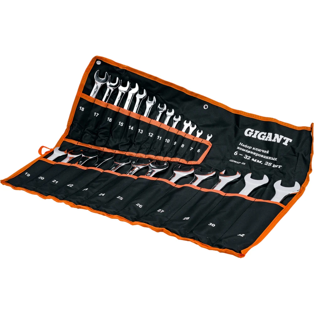 Набор комбинированных ключей Gigant 6 - 32 мм, 25шт., полированный хром GDWSP-25 предназначен для ремонтных работ, когда необходимо осуществить монтаж или демонтаж резьбовых соединений. Изготовлен из хромованадиевой стали и имеет хромоникелевое покрытие, что обеспечивает высокую прочность и долговечность. Для удобства хранения и транспортировки предусмотрен чехол, в котором каждый ключ находится в отдельном кармане.