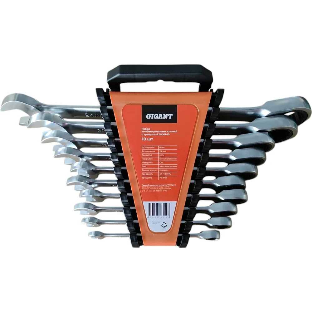 Набор комбинированных ключей Gigant с трещоткой, 10 шт GKKR-10 используется для монтажа и демонтажа резьбовых соединений. Изделия изготовлены из хромванадиевой стали, стойкой к большим нагрузкам. Инструмент состоит из рожковой головки и трещотки для удобной работы в труднодоступных местах. Пластиковый держатель позволяет брать комплект в дорогу и компактно хранить.