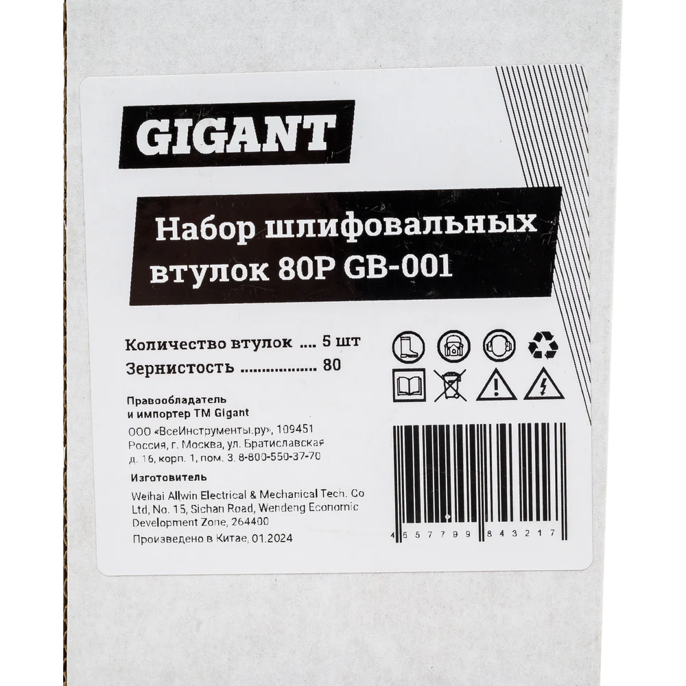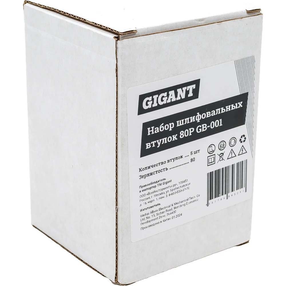 Набор шлифовальных втулок 80P Gigant GB-001 состоит из шести втулок диаметром 13, 19, 26, 38, 51 и 76 мм. С зернистостью абразива (электрокорунд) 80 грит, высота втулок 115 мм. Применяется на осцилляционных станках Gigant OSSJ-450 и OSBSJ-450. Втулки имеют тканную основу с нанесением электрокорунда. Шов встык без притупления абразивного слоя. Предназначены только для обработки древесины и древесных материалов.
