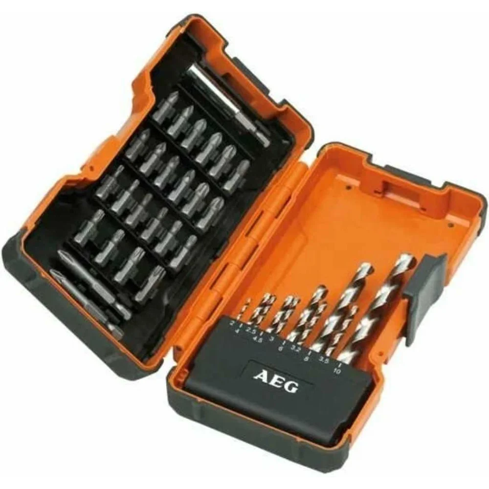 Набор сверл и бит AEG 4932352249 используется совместно с шуруповертами. Сверла в наборе изготовлены из быстрорежущей стали (HSS-G). Комплектация: Биты длиной 25 мм: PH: PH1; PH1; PH2; PH2; PH3; PH3; PZ: PZ1; PZ1; PZ2; PZ2; PZ3; PZ3; TX: TX10; TX10; TX15; TX15; TX20; TX20; TX25; TX25; TX30; TX40. Биты длиной 50 мм: PH2; PZ2. Магнитный держатель с шестигранным хвостовиком 1/4 дюйма.