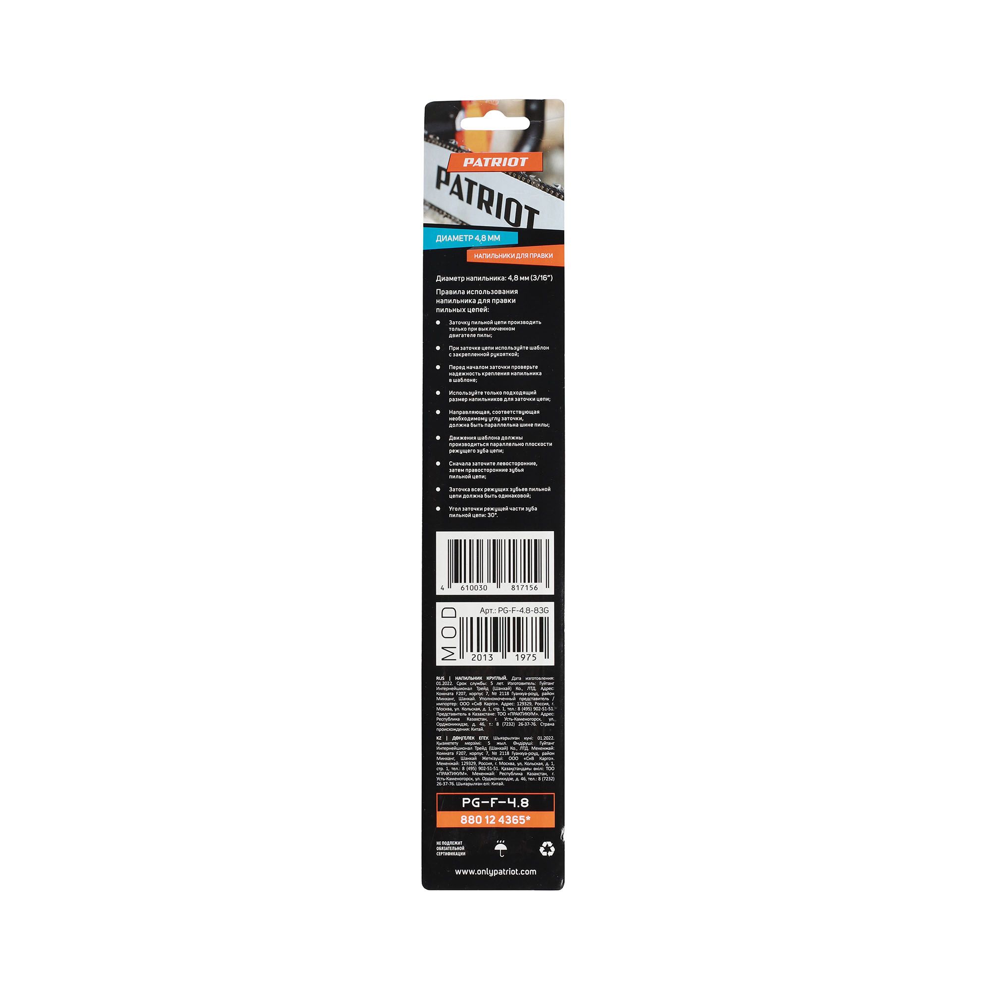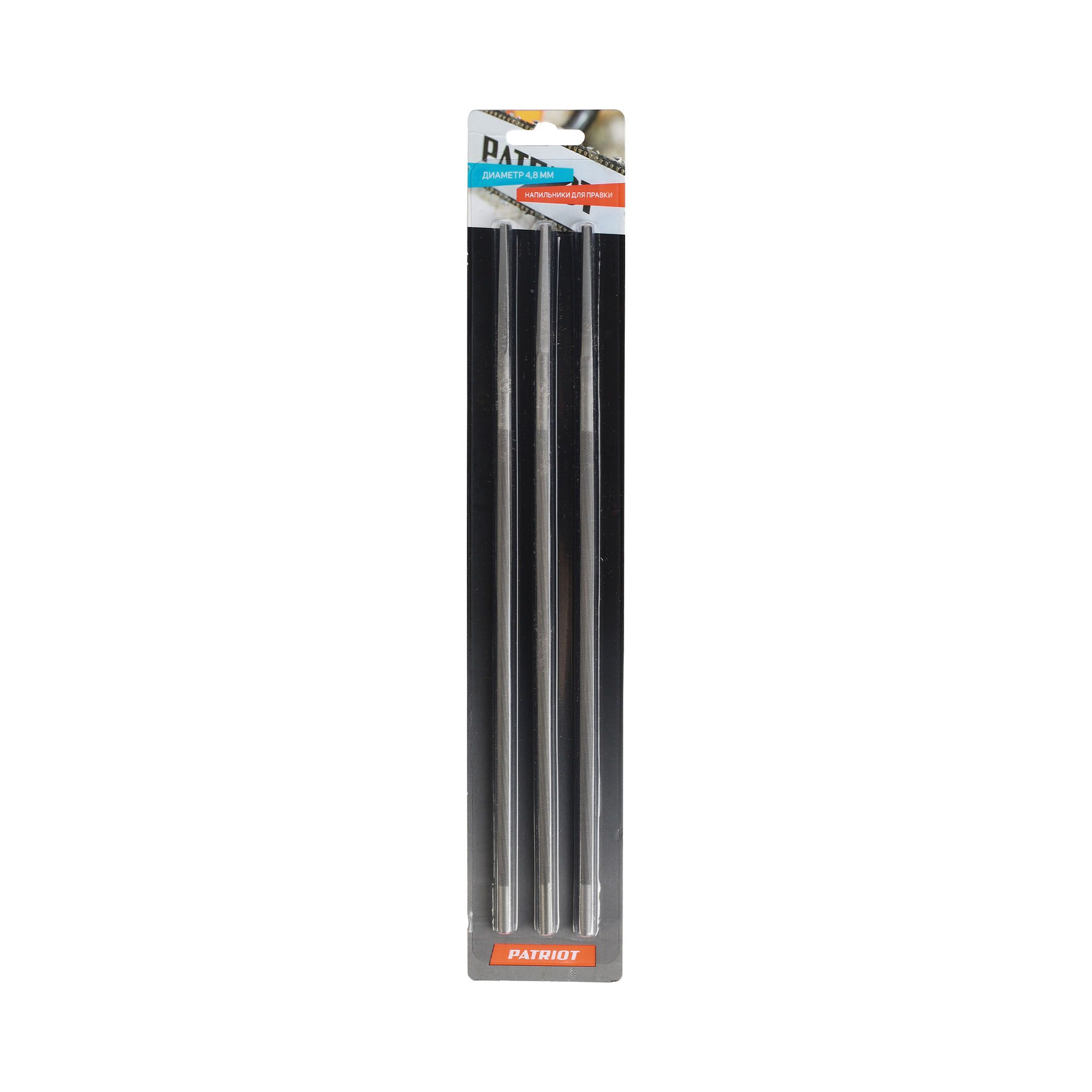 Комплект круглых напильников PATRIOT PG-F-4.8 для заточки низкопрофильных пильных цепей с шагом 0,325. В комплекте 3 шт.