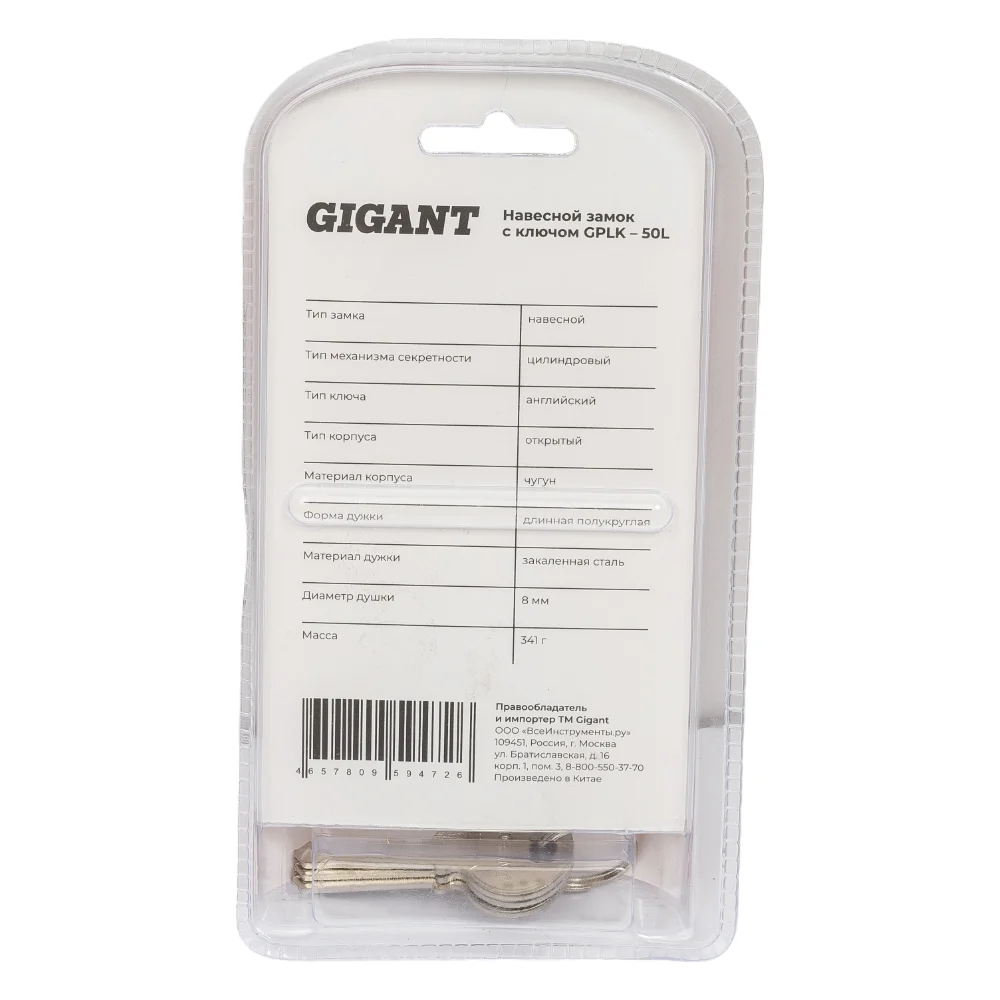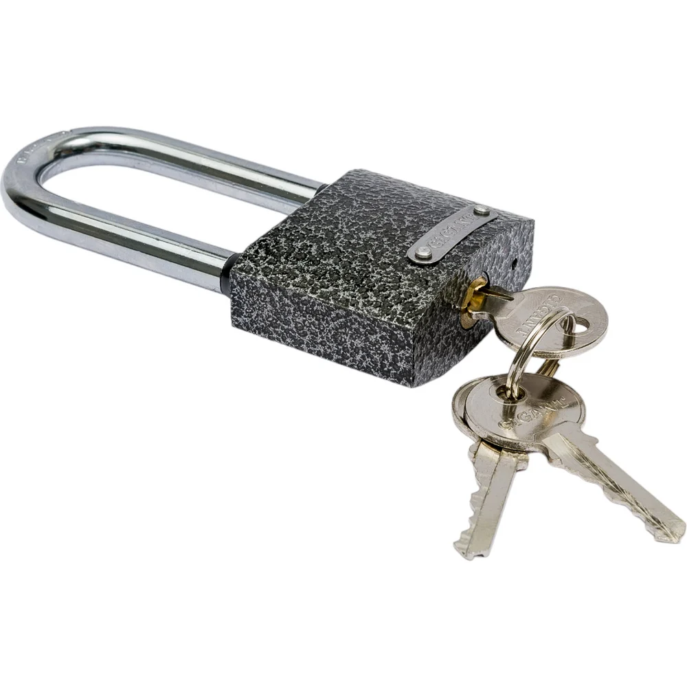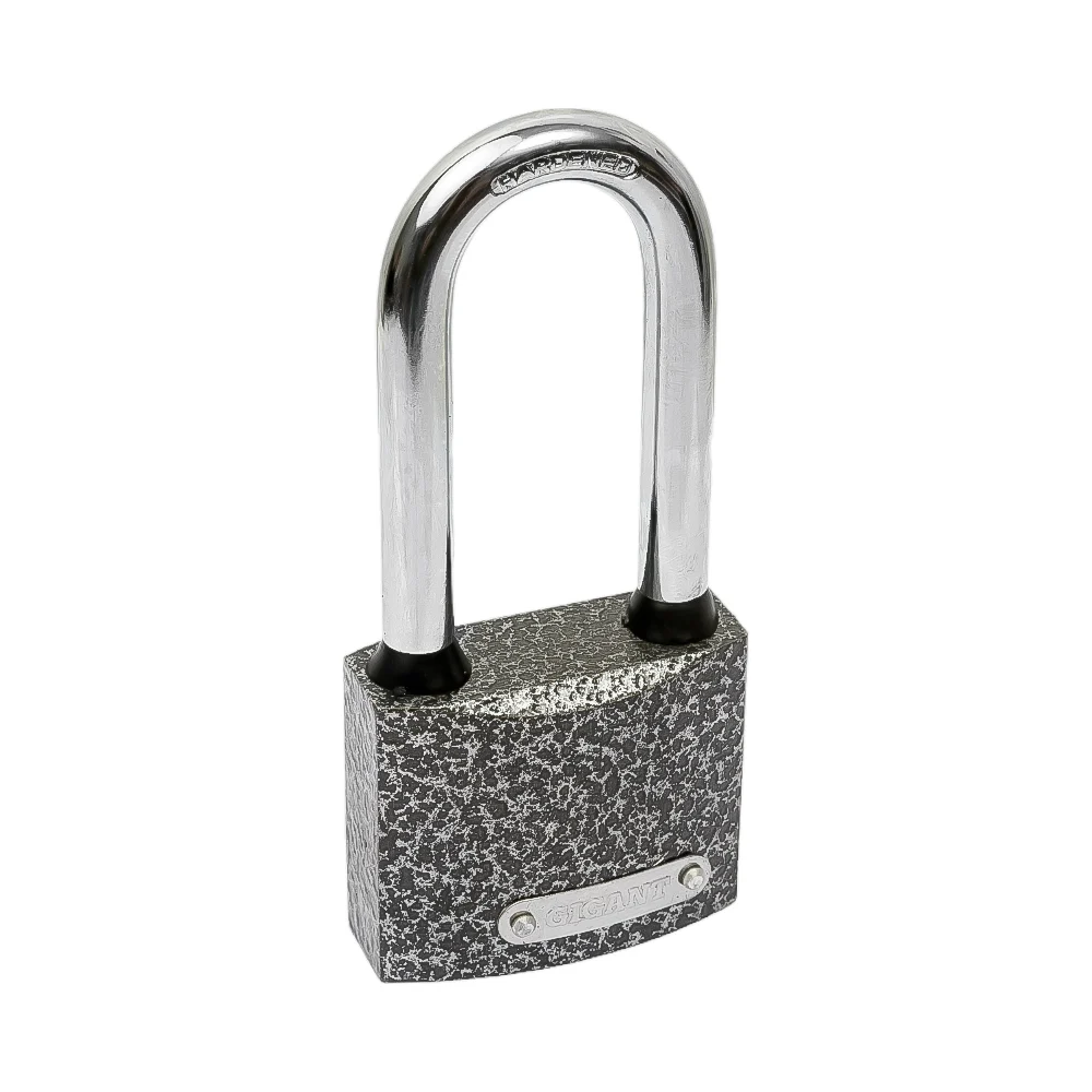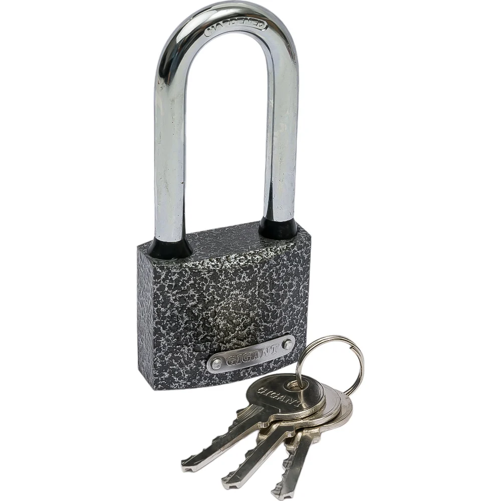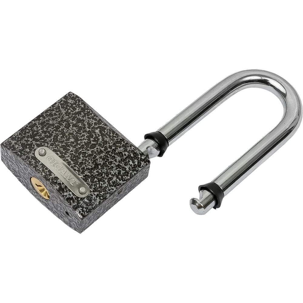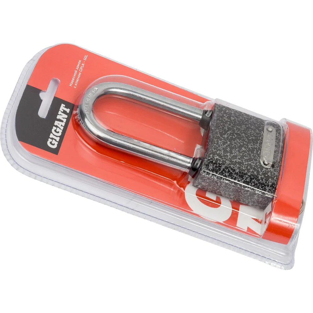 Навесной замок с ключом Gigant GPLK-50L имеет чугунный корпус с порошковым антикоррозийным покрытием и удлиненной закаленной стальной дужкой. Места стыка дужки и замка защищены от попадания воды резиновыми кольцами.