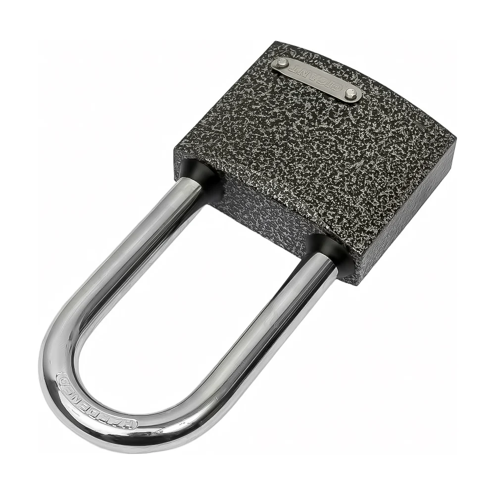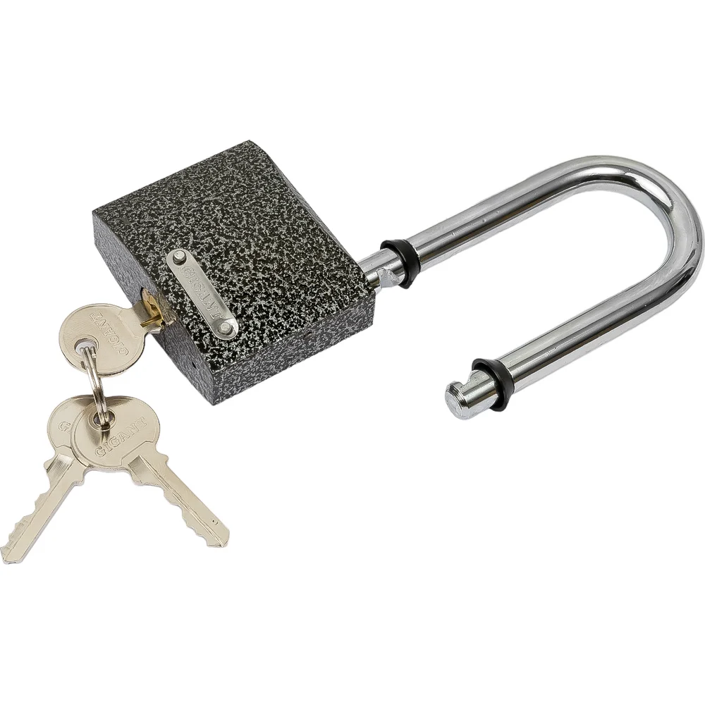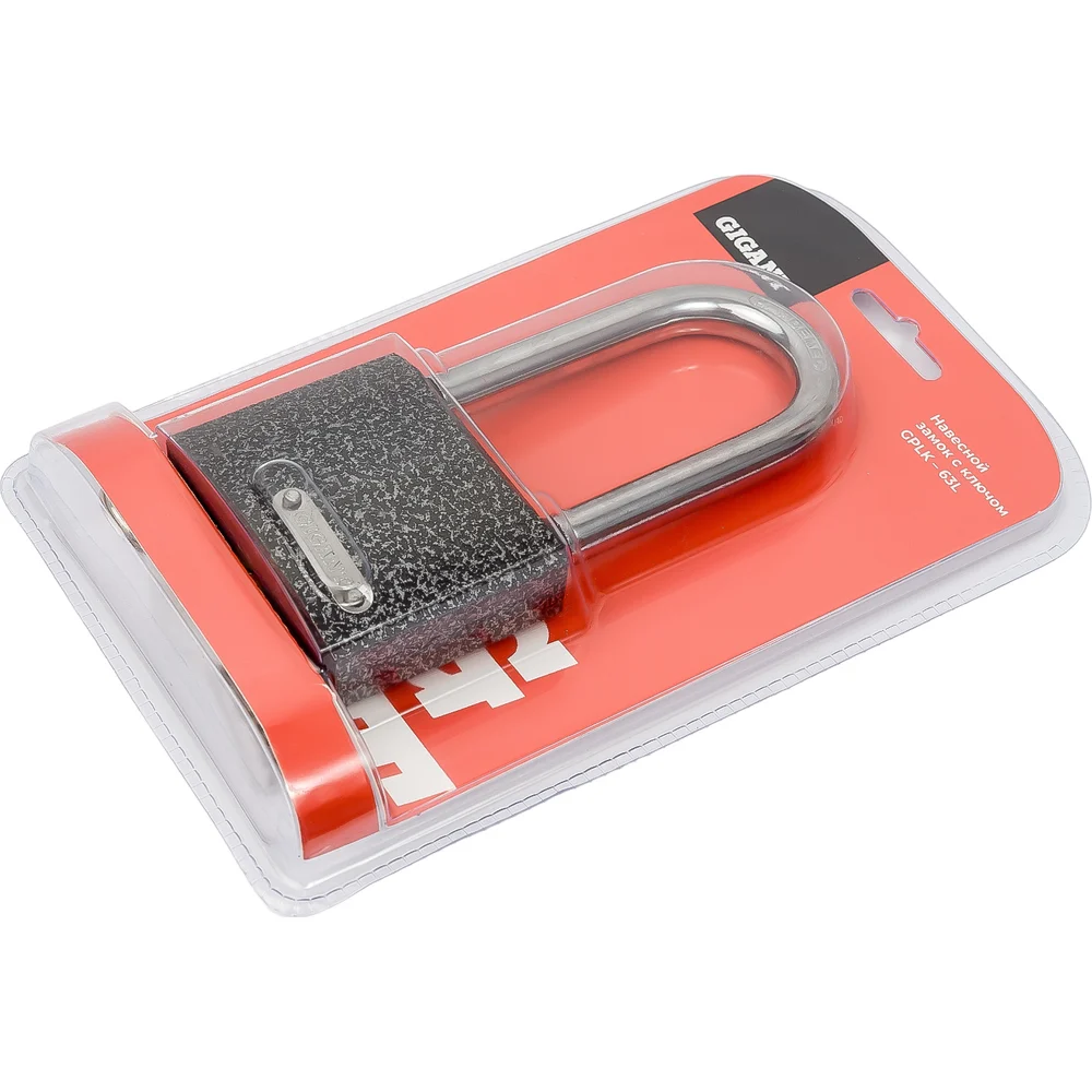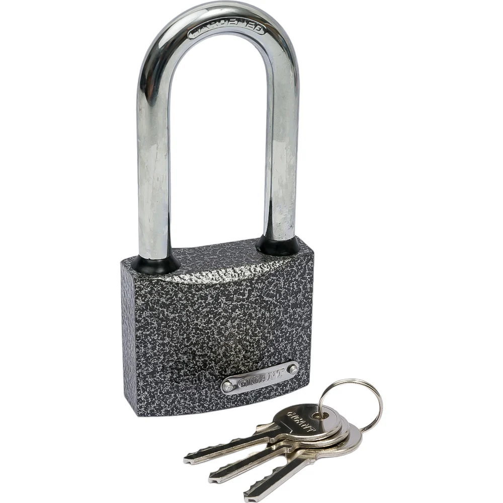 Навесной замок с ключом Gigant GPLK-63L имеет чугунный корпус с порошковым антикоррозийным покрытием и удлиненной закаленной стальной дужкой. Места стыка дужки и замка защищены от попадания воды резиновыми кольцами.