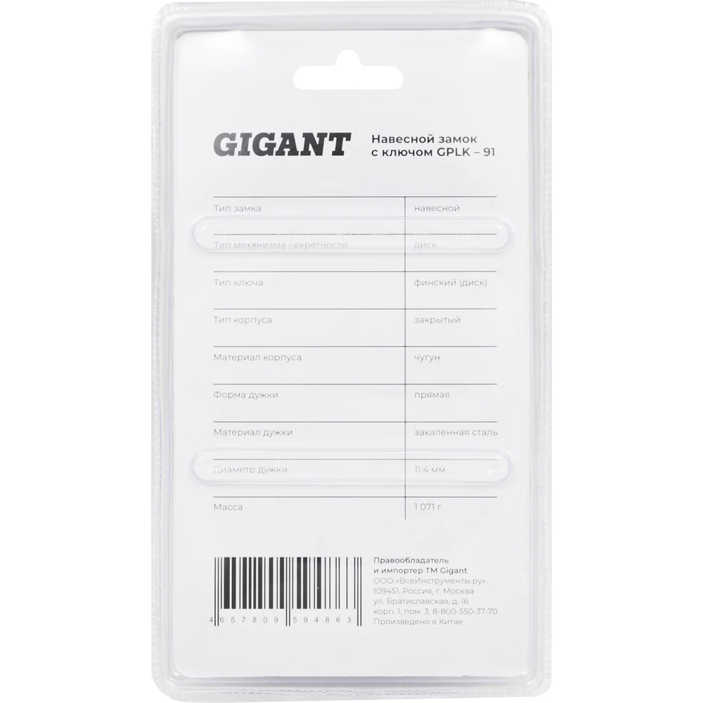 Навесной замок с ключом Gigant GPLK-91 используют для гаражных дверей. Механизм П-образной формы выполнен из прочного металла. Корпус полностью закрывает запорный штырь из закаленной стали, исключая возможность спиливания. В комплект поставки входят 3 ключа финского типа с уникальным кодом.