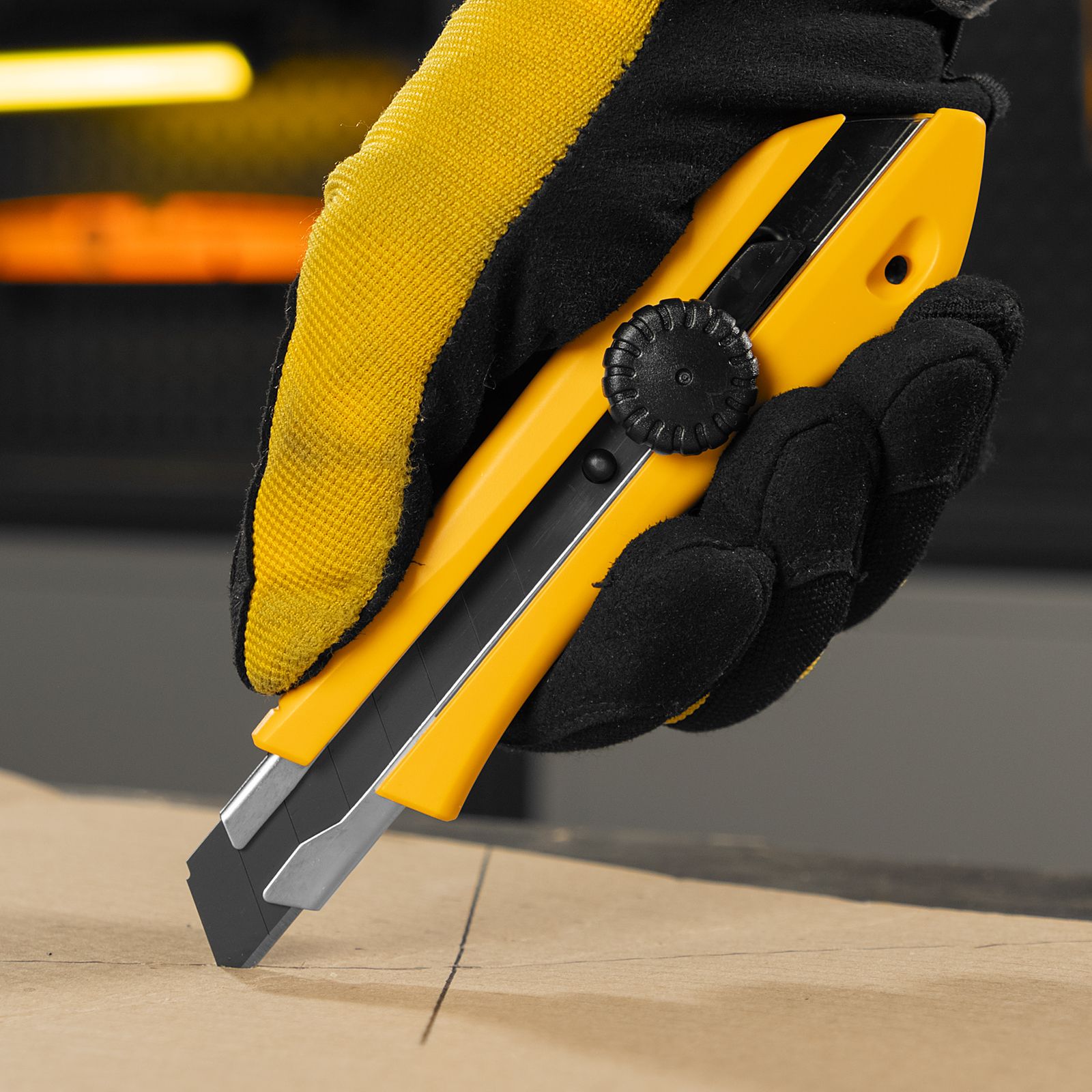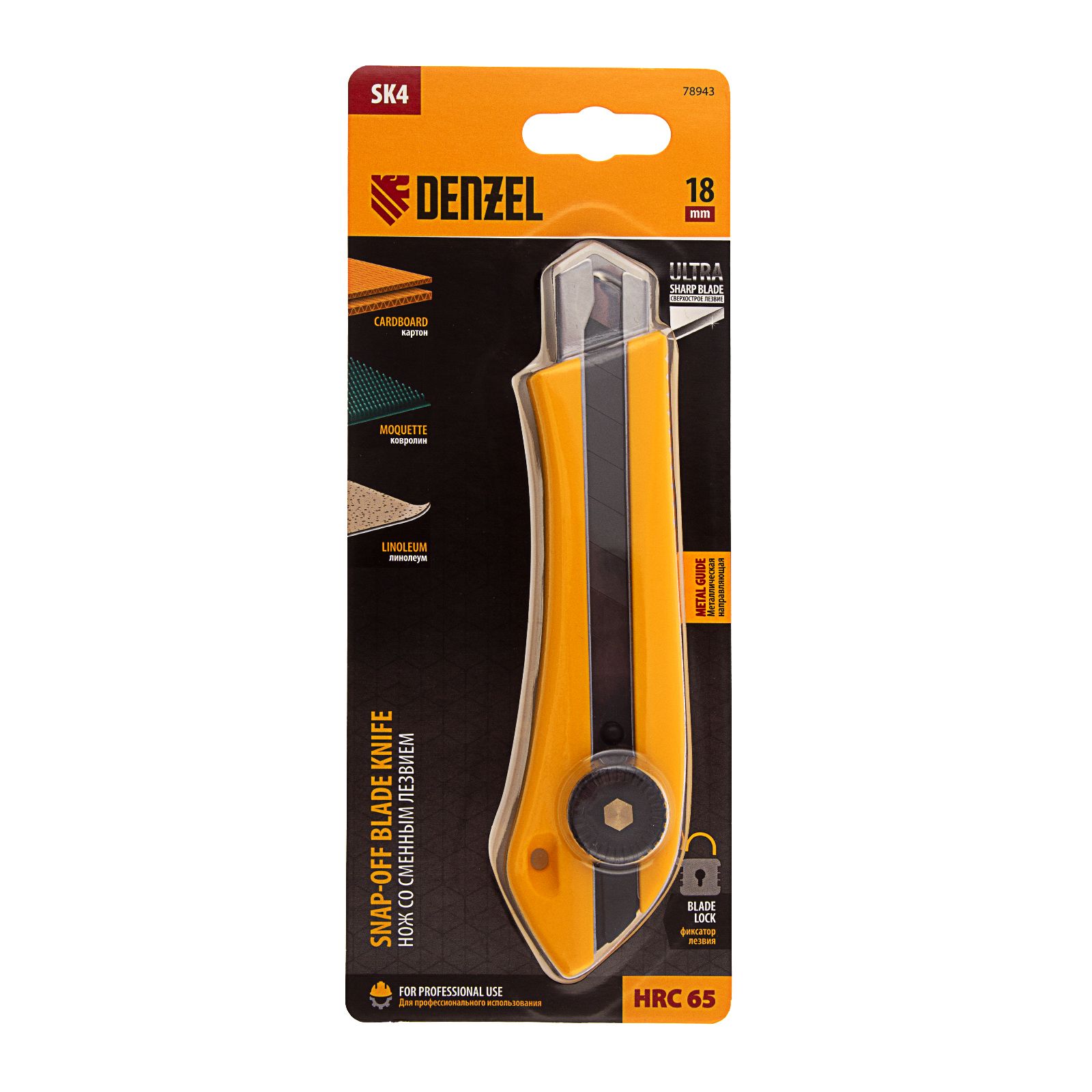 Нож Denzel 78943 со сменным лезвием шириной 18 мм, изготовленным из стали SK4, оснащен винтовым фиксатором и металлической направляющей. Сверхострое выдвижное лезвие легко режет линолеум, ковролин, бумагу, обои, картон и другие листовые материалы. Нож рекомендован для профессионального применения, пригодится также в домашнем хозяйстве.