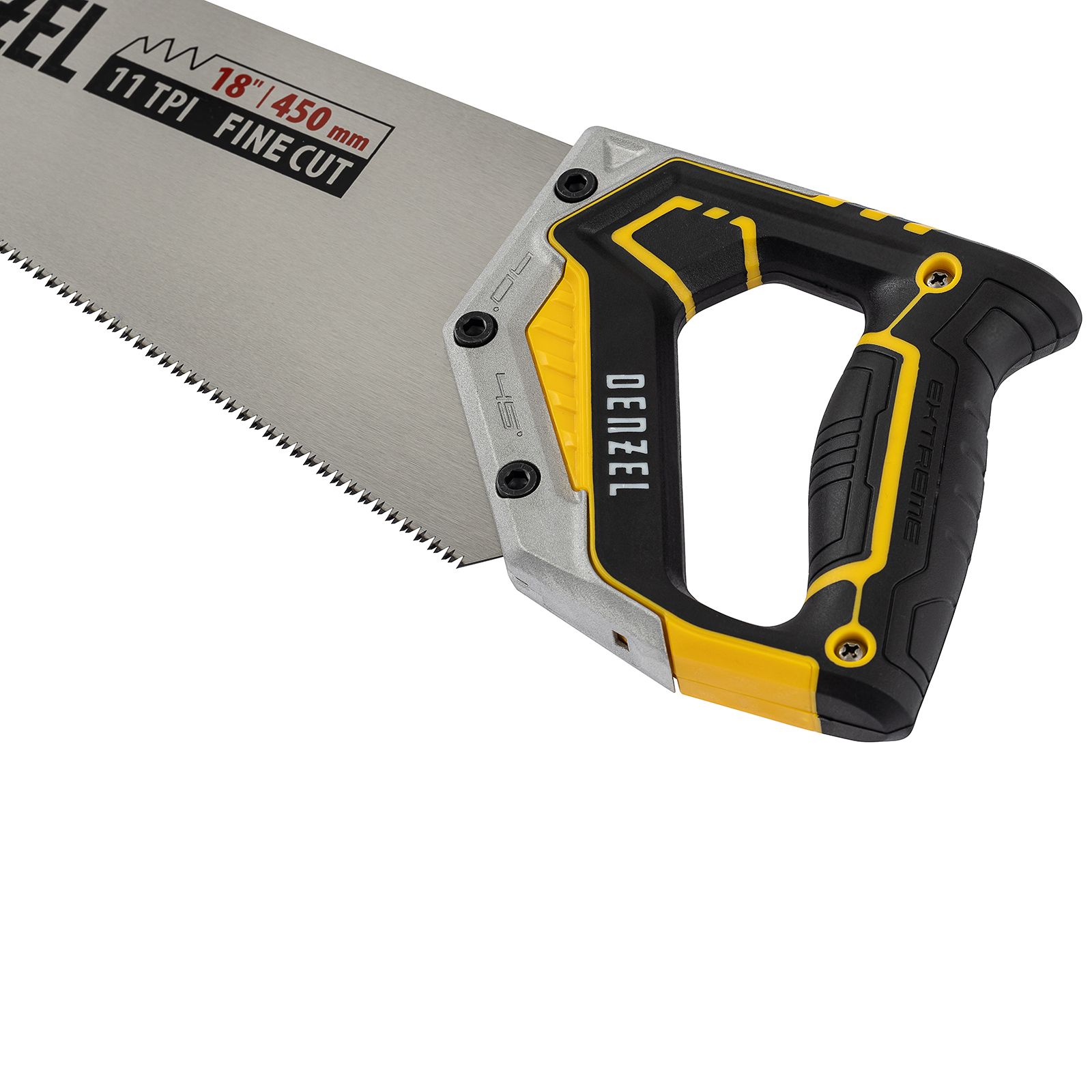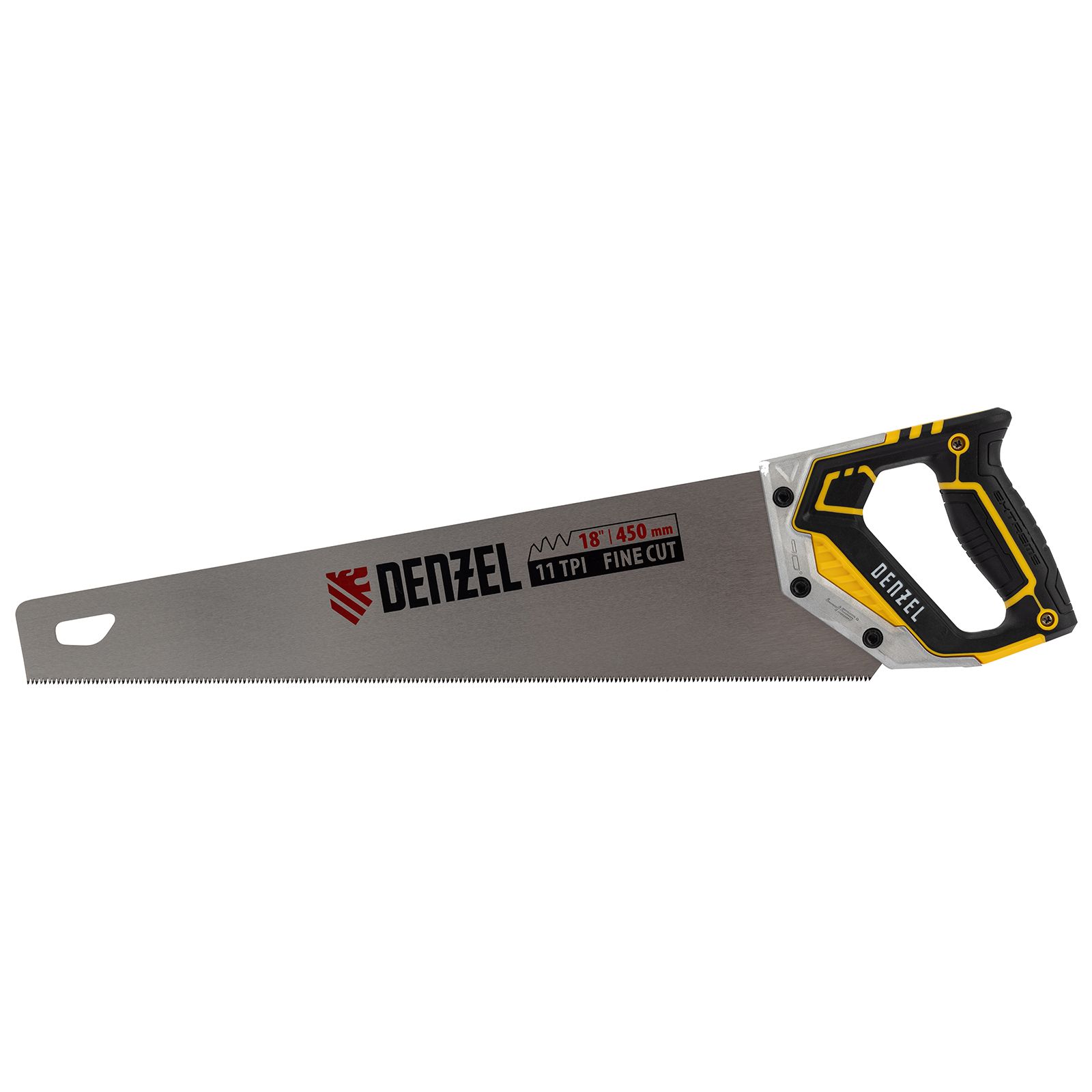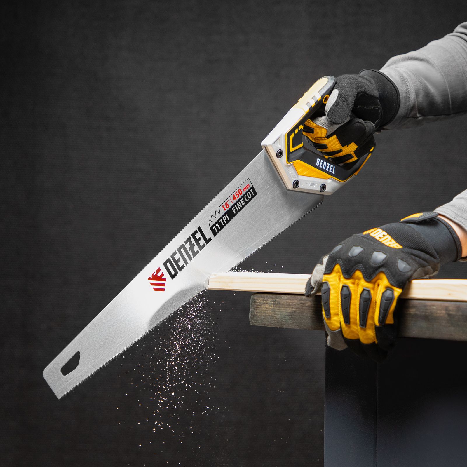 Ножовка по дереву Denzel 24141 длиной 450 мм, с зубьями с шагом 11 TPI и 3D-заточкой, с металлопластиковой рукояткой, предназначена для продольной и поперечной распиловки заготовок из древесины, ДСП, ДВП, МДФ, ламината, а также из ПВХ (труб, панелей, коробов). Подходит для распиливания плинтусов, вагонки, деревянных профилей. Мелкие зубья с шагом 11 TPI позволяют выполнять точный и чистый рез. Ножовка используется для проведения столярных работ в мастерской и на дачном участке.