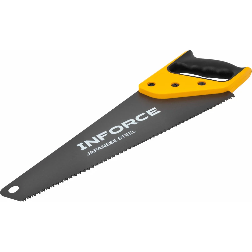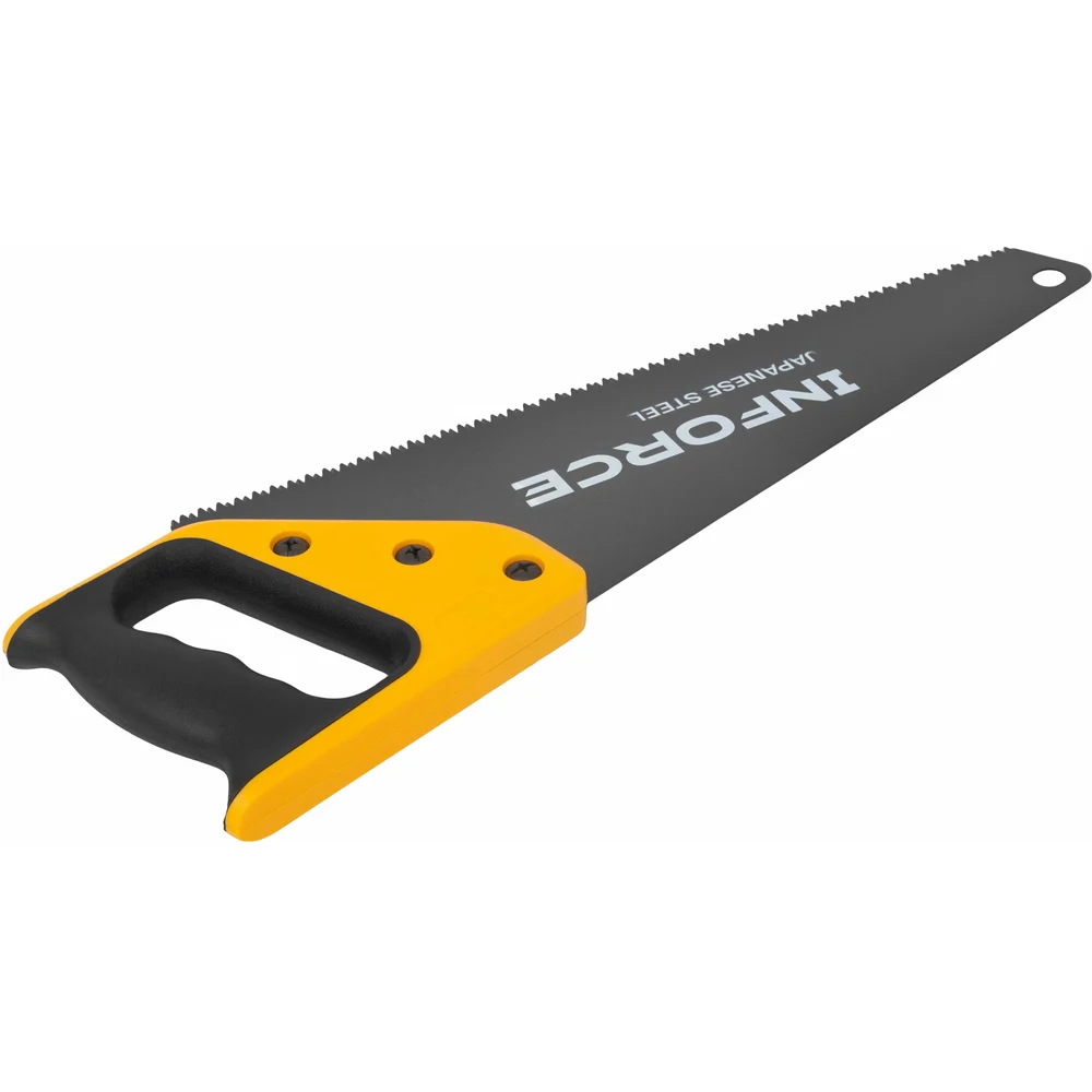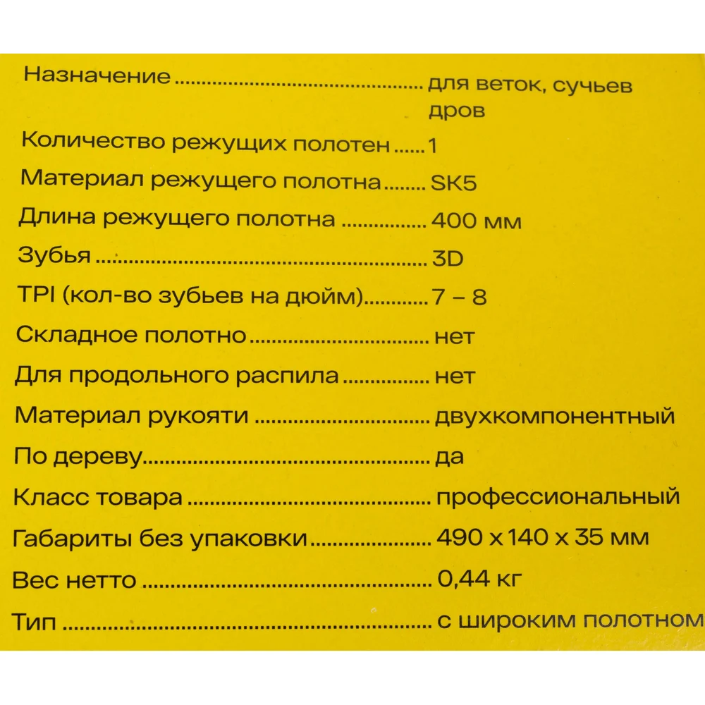 Ножовка по дереву Inforce 7-8 TPI, 400 мм 06-08-29 представляет собой профессиональный инструмент, предназначенный для работы с деревом. Она оснащена широким полотном длиной 400 мм, что делает её идеальной для распила веток, сучьев и дров. Режущее полотно изготовлено из высококачественной стали SK5, обеспечивающей долговечность и надежность в эксплуатации. Зубья с 3D профилем и плотностью 7-8 TPI способствуют эффективному и быстрому распилу, минимизируя усилия пользователя. Двухкомпонентная рукоять обеспечивает удобный и надежный хват, что особенно важно при длительной работе.