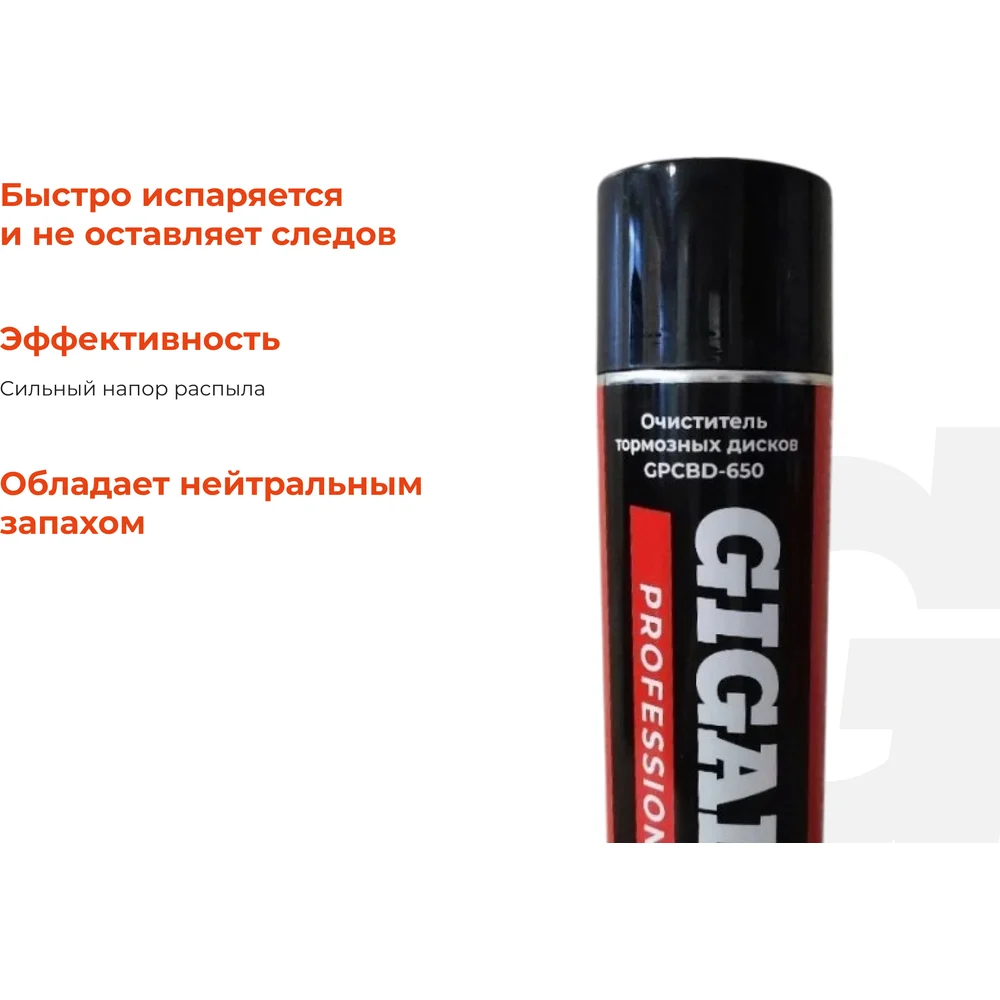 Очиститель тормозных дисков Gigant Professional 650мл GPCBD-650 используется для качественной очистки элементов тормозной системы от смол, нагара, масляных и других загрязнений. Повышает эффективность торможения, сокращает тормозной путь. За 1 – 2 минуты очищает и обезжиривает тормозные механизмы и любые металлические детали Повышает эффективность торможения Устраняет лязг и скрип при торможении Содержит безопасные растворители Не провоцирует коррозию Быстро испаряется, не оставляя следов Рекомендован к применению при каждом обслуживании тормозной системы Подходит для очистки любых металлических деталей Экономичен в применении Нейтральный запах