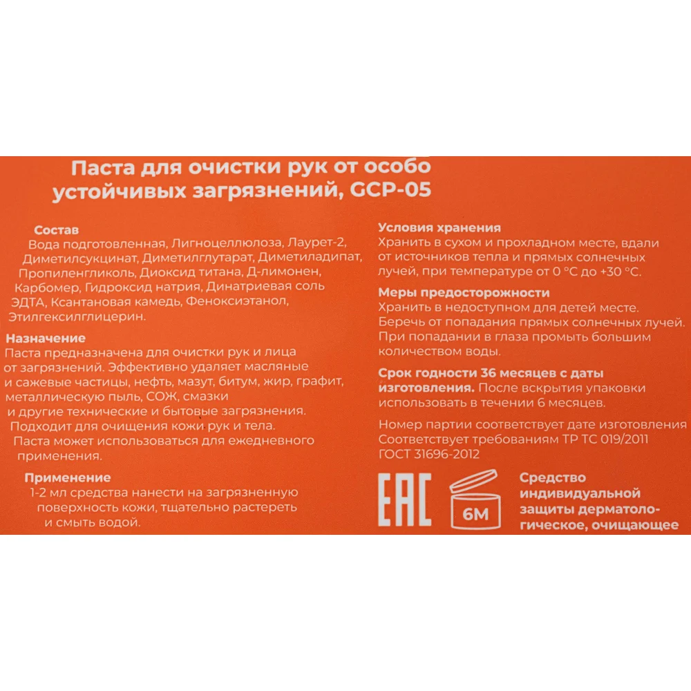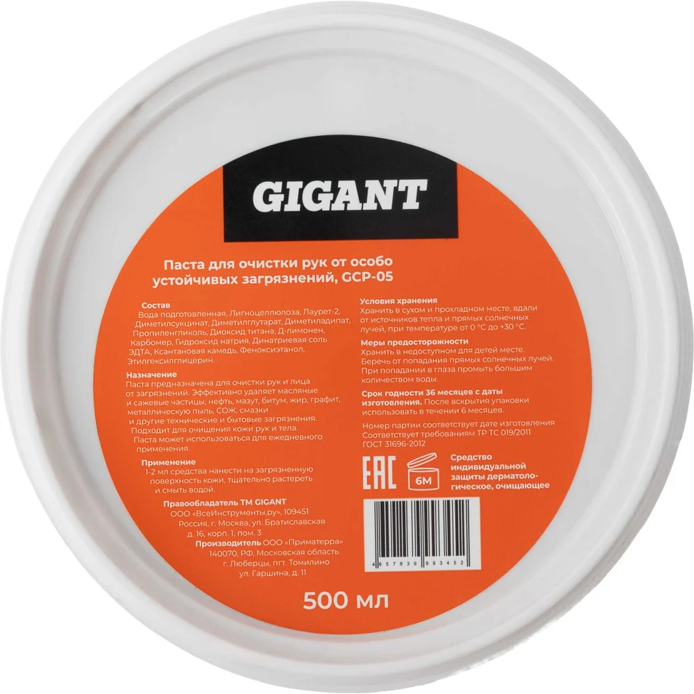 Паста для очистки рук Gigant 500 мл GCP-05 удаляет сложные технические загрязнения рук. Натуральные скрабирующие компоненты, входящие в состав, обеспечивают полное и глубокое очищение кожи, не травмируя ее. Паста проста и удобна в применении, хорошо пенится, быстро смывается проточной водой. Соответствует требованиям ТР ТС 019/2011 и ГОСТ 31696-2012.