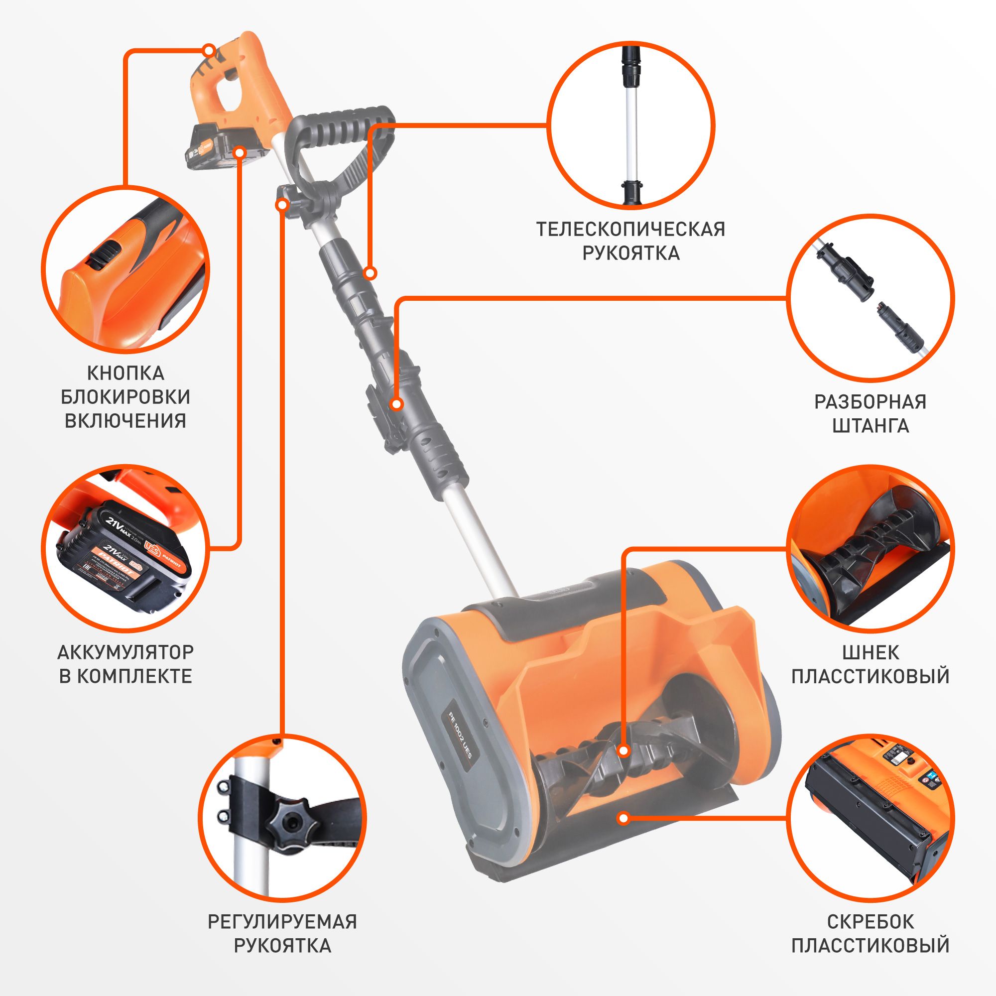 Аккумуляторная лопата-снегоуборщик PATRIOT PE 1002 UES для очистки дорожек на приусадебных участках или городских дворах. Телескопическая рукоятка позволит без труда убрать инструмент в небольшой шкаф или в багажник легкового автомобиля. Шнек выполнен из пластика, не оставляющего царапин на декоративных покрытиях участка. Для питания используется аккумулятор системы UES, входящий в комплект поставки.