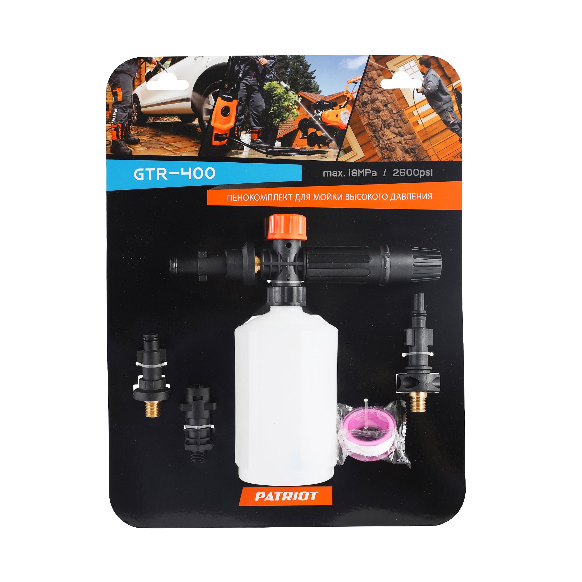 Пенокомплект PATRIOT GTR 400 используется для мытья автомобилей, садовой техники, фасадов зданий и других поверхностей. Пенокомплект формирует густую стойкую пену.