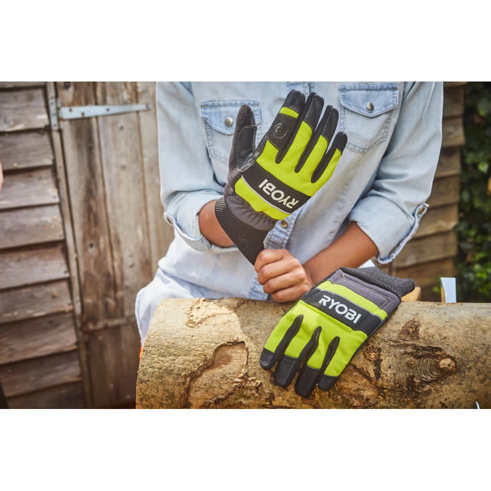 Класс защиты 2 (защита от пильной цепи со скоростью до 24м/с) для работы с любой цепной пилой Ryobi Премиальное качество перчаток, изготовленных из козьей кожи, обеспечивает воздухопроницаемость, мягкость и возможность стирки Технология сенсорного экрана на правом указательном пальце Эластичный охват запястья для максимального комфорта Защита левой руки, расположенной ближе к пильной цепи, от несчастного случая при отдаче Прочная кожа с эластичной тканью