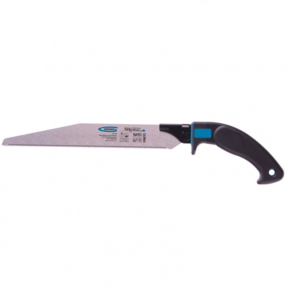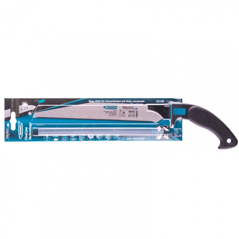 Пила Gross PIRANHA МИНИ 23109 со сменным полотном длиной 240 мм, с калеными зубьями 3D с шагом 17-18 TPI, используется для тонких работ по древесине, фанере, ДВП, ПВХ. Рабочая кромка с мелкими зубьями с шагом 17-18 TPI выполняет ровный и гладкий рез. Зубья вырезаны и одновременно заточены алмазным кругом, что обеспечивает высокую производительность инструмента. Съемное полотно при необходимости можно заменить. Инструмент применяется для проведения точных столярных работ дома или в мастерской.