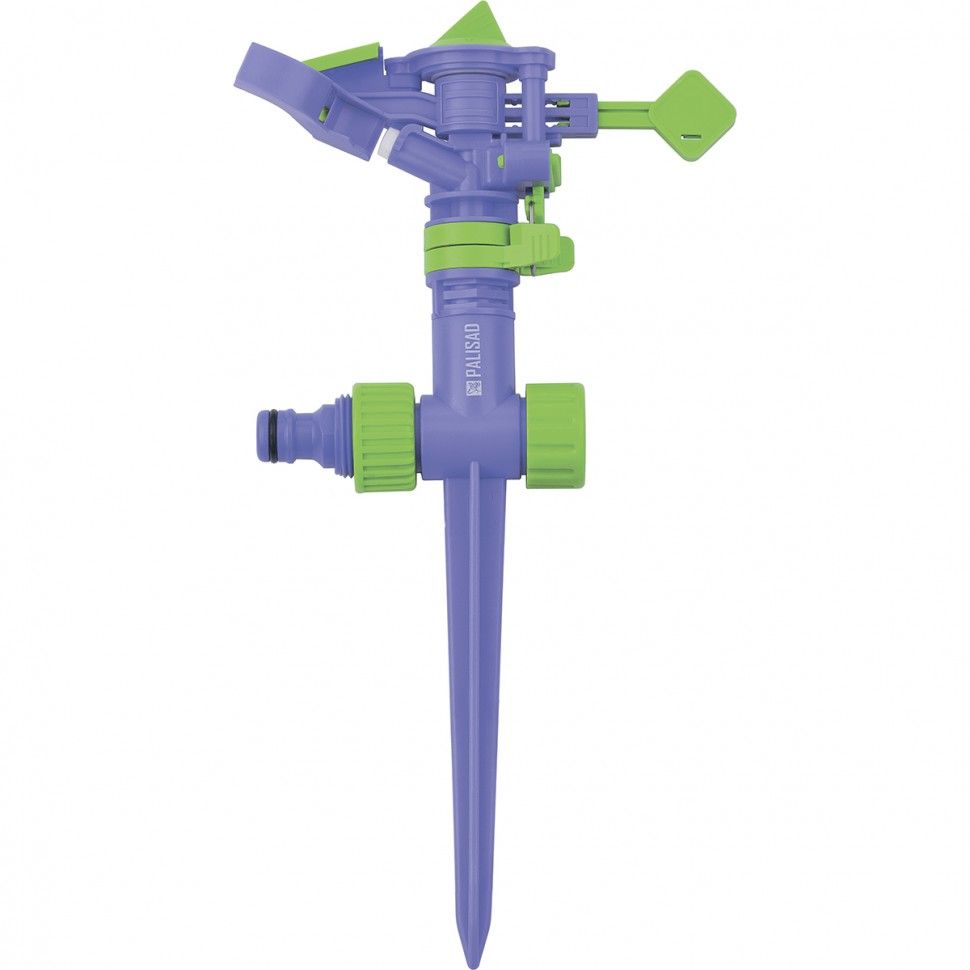 Пластиковый импульсный разбрызгиватель Palisad 65414 с регулятором скорости предназначен для кругового или секторного полива участков площадью до 500 кв.м. Используется для орошения декоративных или сельскохозяйственных растений. Функция регулировки мощности и угла выброса струй позволяет подобрать оптимальный режим полива. Дальность разбрызгивания варьируется в диапазоне 3-12 м. Дождеватель надежно фиксируется в почве при помощи заостренной пики.