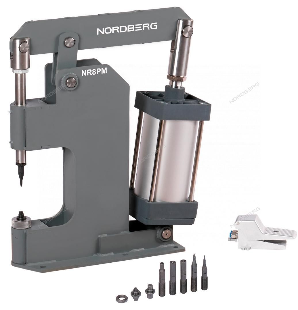 Пневматический станок NR8PM предназначен для установки и удаления заклепок на легковых, грузовых автомобилях и спецтехники. Используется при замене накладок тормозных колодок и дисков сцепления, цилиндр 160 мм позволяет работать с заклепками диаметром до 12 мм.