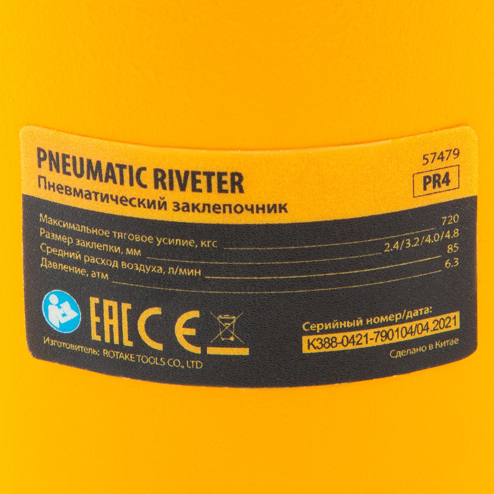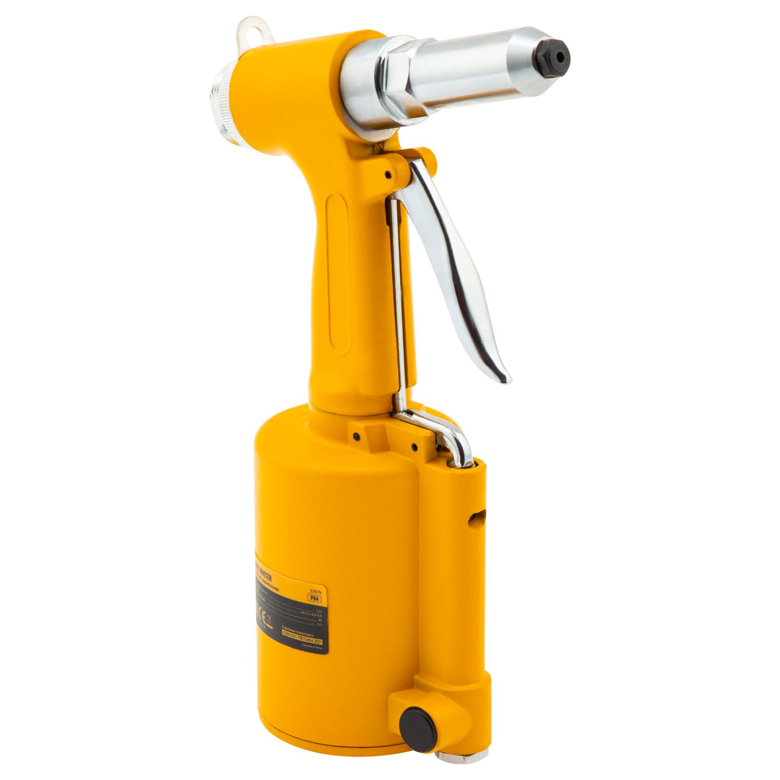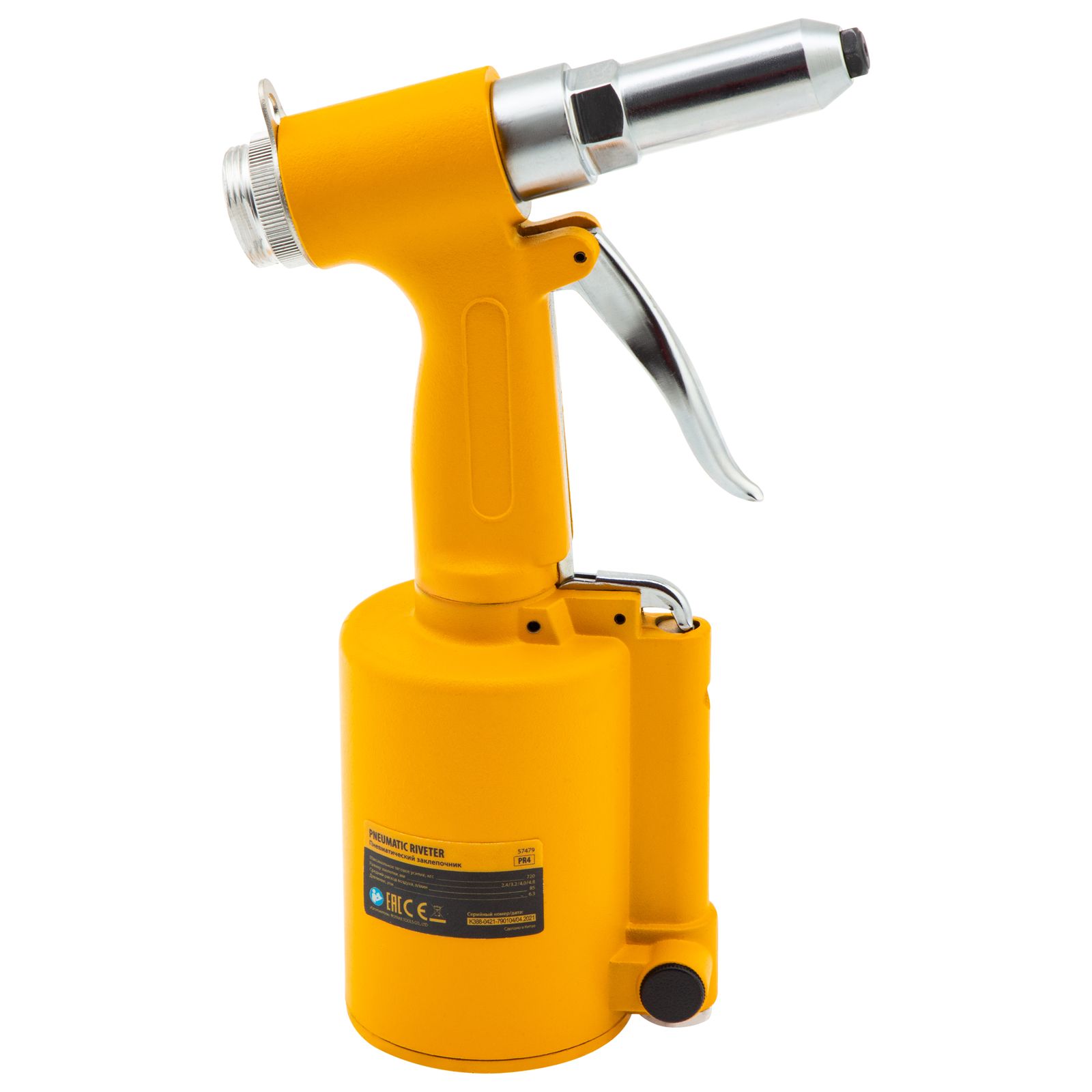 Пневматический заклепочник Denzel PR4 57479 значительно упрощает работу в автосервисах, домашних мастерских, на малых предприятиях и на ремонтных площадках. С его помощью можно без усилий скрепить листовой, профильный и панельный материал из пластика и металла.,Пистолет для вытяжных заклепок работает под давлением 6,3 АТМ и расходует всего 85 литров воздуха в минуту, поэтому для него подойдет компрессор средней мощности. В качестве оснастки используются заклепки размером 2,4-4,8 мм. В комплект поставки входит 4 насадки под заклепки размерами 2,4 мм, 3,2 мм, 4 мм и 4,8 мм.