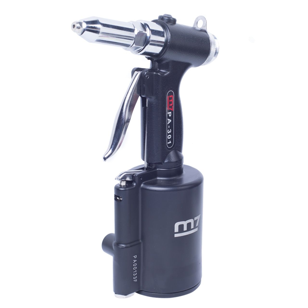 Сила вытягивания, кг 1045 Длина хода, мм 16 Минимальный диаметр заклепки, мм 2,4 Максимальный диаметр заклепки, мм 4,8 Расход воздуха, л/мин 283 Рабочее давление, атм 6,3 Уровень шума, Дб 79,7 Диаметр впускного отверстия 1/4" NPT Рекомендованный внутренний диаметр шланга, мм 10 Вес, кг 1,5