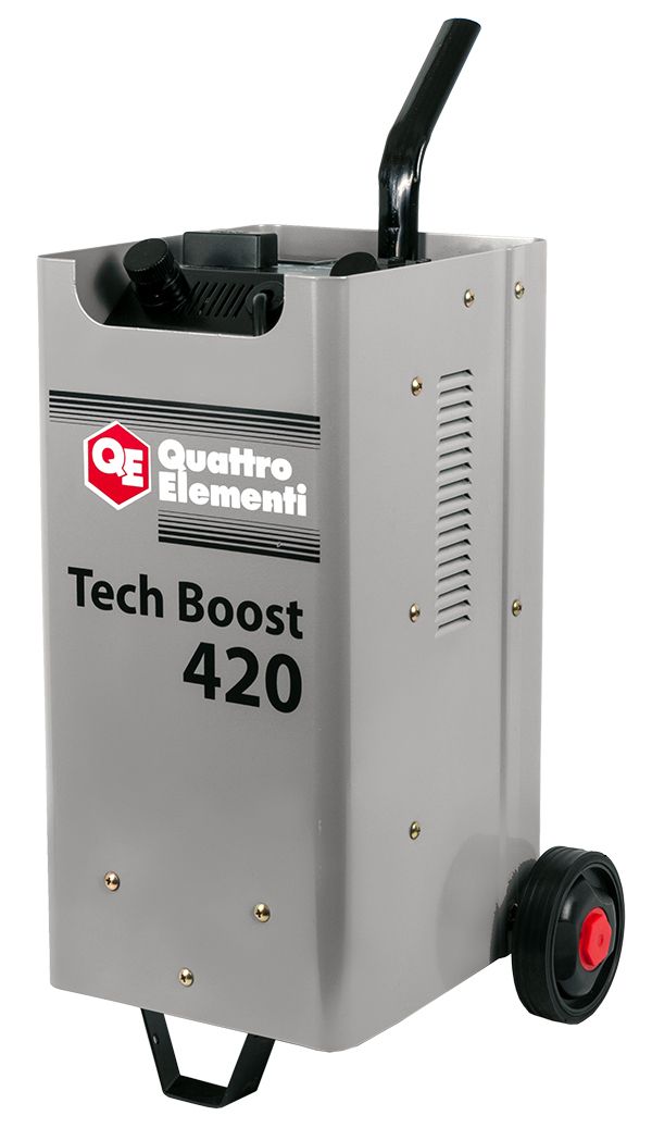 Пуско-зарядное устройство Tech Boost 420 предназначено для заряда свинцово-кислотных АКБ и помощи в запуске двигателя. Напряжение батареи 12 и 24 В. Его отличительные особенности: цифровой диплей, 4 режима заряда, отсек для хранения проводов, колеса для транспортировки.