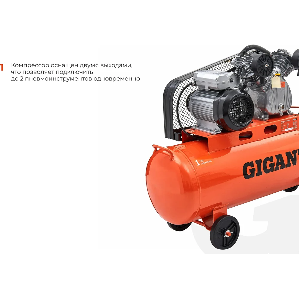Ременной компрессор Gigant BCL-100 предназначен для подачи воздуха в пневмоинструмент. Широко используется в автомастерских, а так же строительных и производственных площадках. Данная модель имеет широкую ручку на корпусе и колеса для удобной транспортировки. Материалы: Цилиндр: чугун; Поршень: алюминиевый сплав; Голова: алюминиевый сплав; Трубки: алюминий; Обмотка асинхронного двигателя: алюминий.
