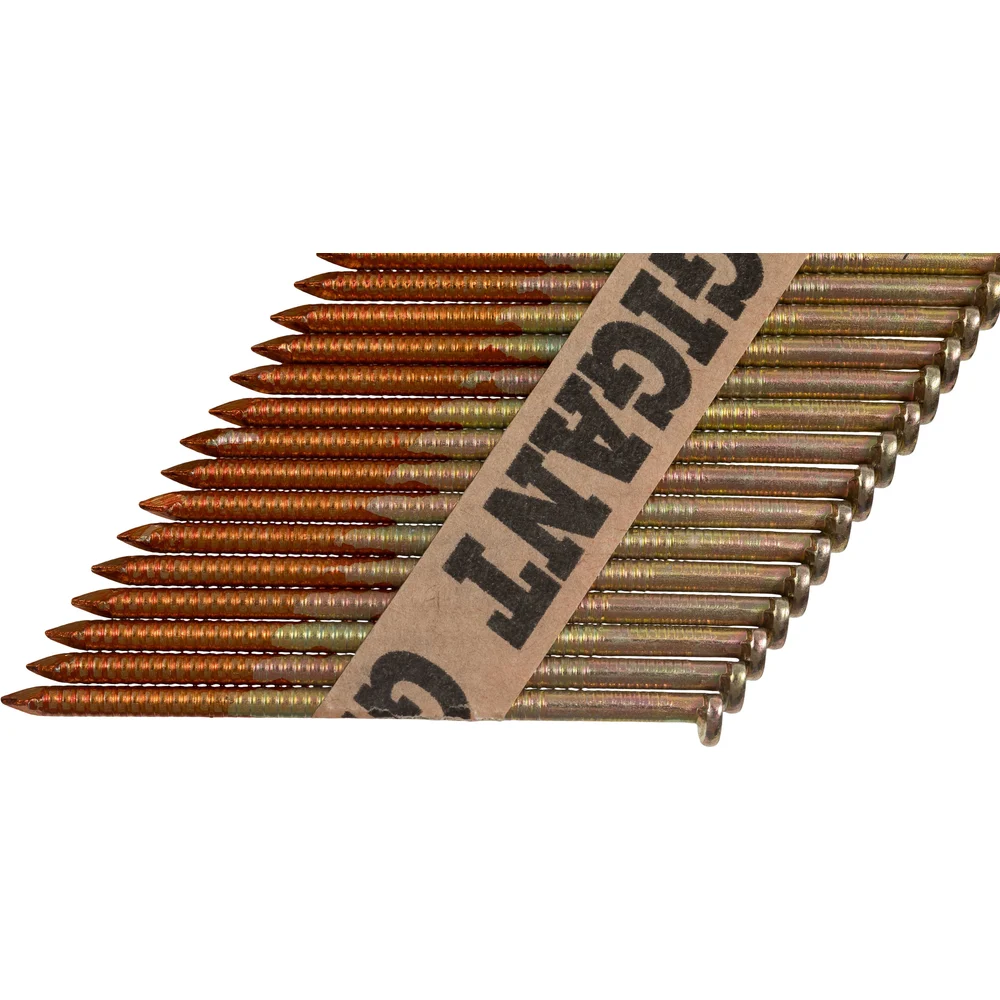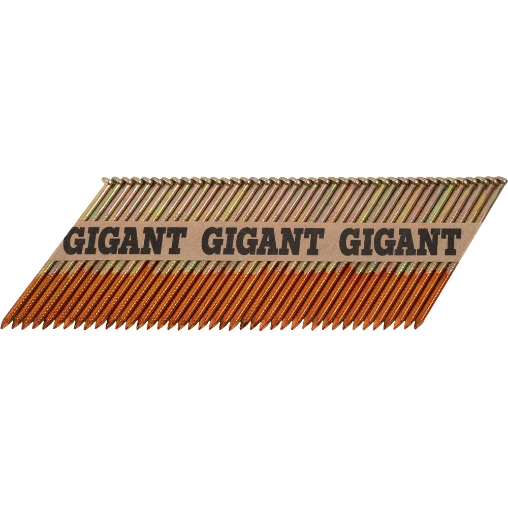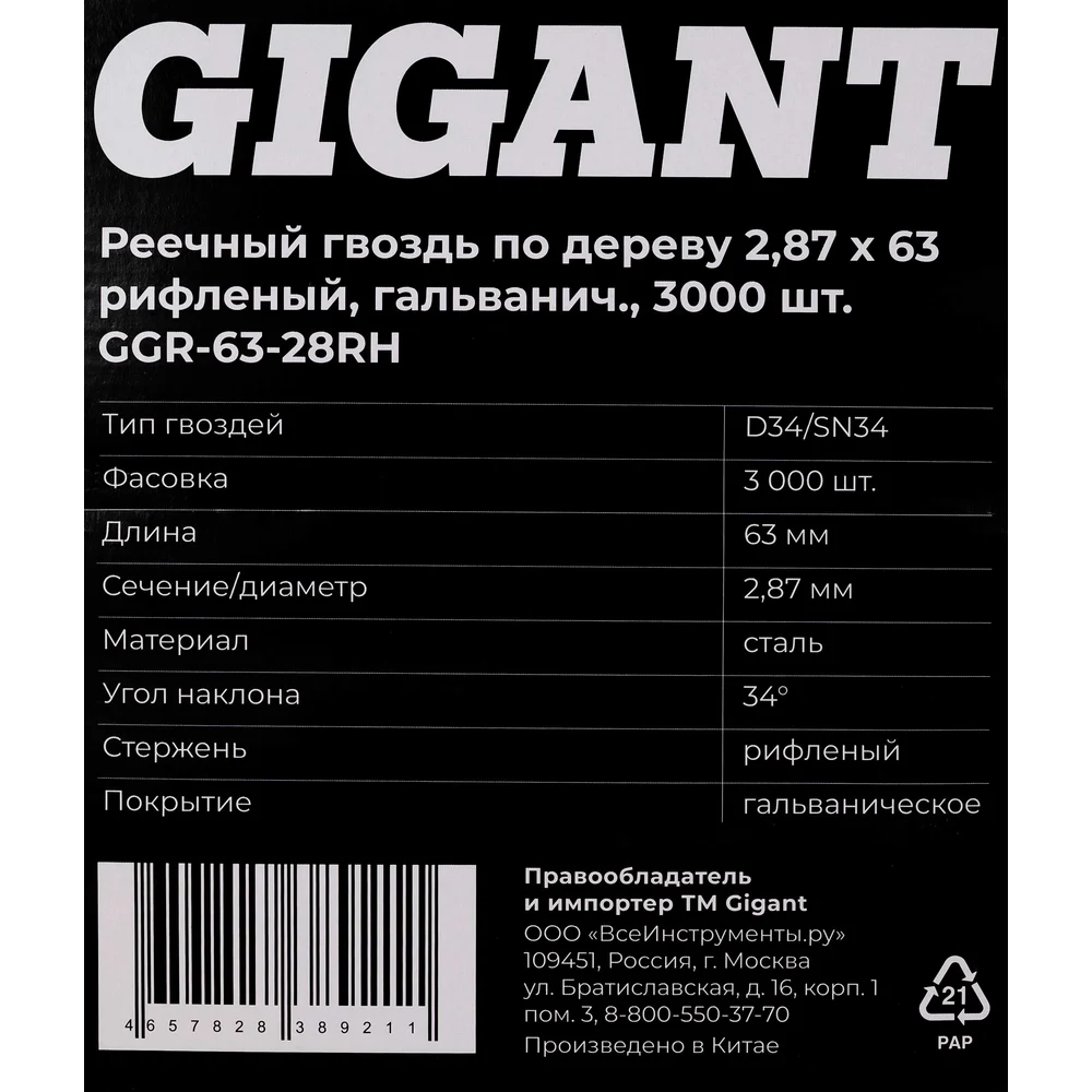 Реечный гвоздь по дереву Gigant GGR-63-28RH используется в строительстве (сборке стропильных систем, деревянных каркасов), упаковочных работах и иных сферах. Рифленый стержень обеспечивает надежное сцепление с материалом, предотвращая выскальзывание. Упаковка из 3000 штук делает их экономичным выбором для крупных проектов. Гальваническое покрытие защищает гвозди от коррозии и позволяет использовать их даже в агрессивных средах. Расположены под углом 34 градуса, это позволяет не задевать шляпку соседнего гвоздя при монтаже и увеличивает срок службы пистолета. В комплекте 75 кассет на бумаге, в каждой кассете по 40 гвоздей. Могут использоваться с газовыми или аккумуляторными пистолетами большинства производителей, представленных на рынке (Hybest, Fubag, Зубр, Metabo и др.). Кольцевая накатка обеспечивает повышенное сцепление с древесиной. Бумажная основа и клей подобраны таким образом, что кассеты не разбиваются при падении, а при монтаже бумага полностью отделяется с гвоздем и не застревает в обойме.