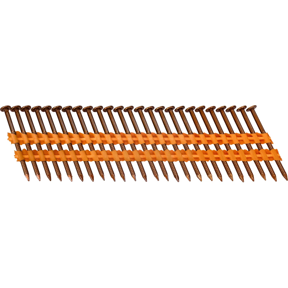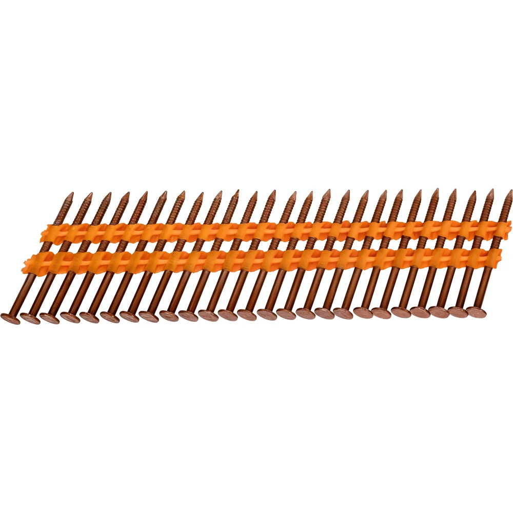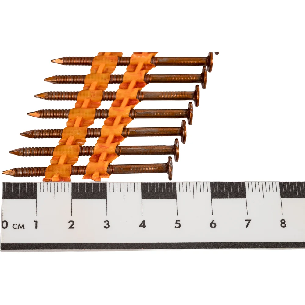 Реечный гвоздь по дереву Gigant GGR-50-28RZ/6000 используется в строительстве (сборке стропильных систем, деревянных каркасов), упаковочных работах и иных сферах. Рифленый стержень обеспечивает надежное сцепление с материалом, предотвращая выскальзывание. Упаковка содержит 6000 штук, что позволяет эффективно использовать их в крупных проектах, обеспечивая экономию времени и ресурсов. Расположены под углом 21 градус. Могут использоваться с газовыми или аккумуляторными пистолетами большинства производителей, представленных на рынке (Hybest, Fubag, Зубр, Metabo и др.). Кольцевая накатка обеспечивает повышенное сцепление с древесиной. Основа обоймы - пластик.