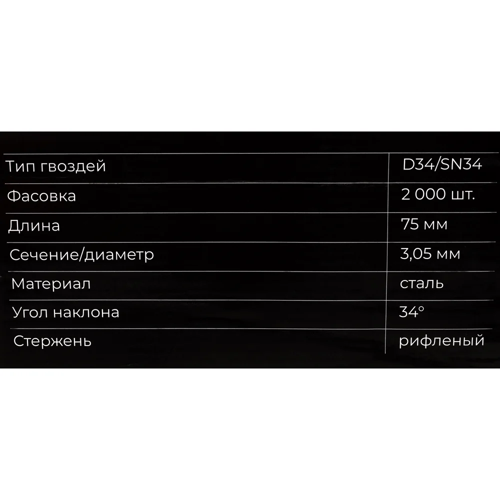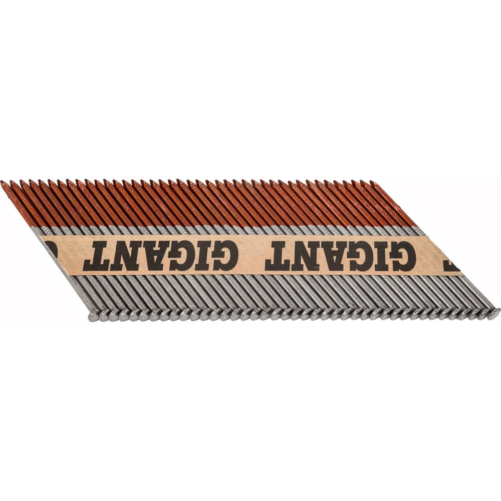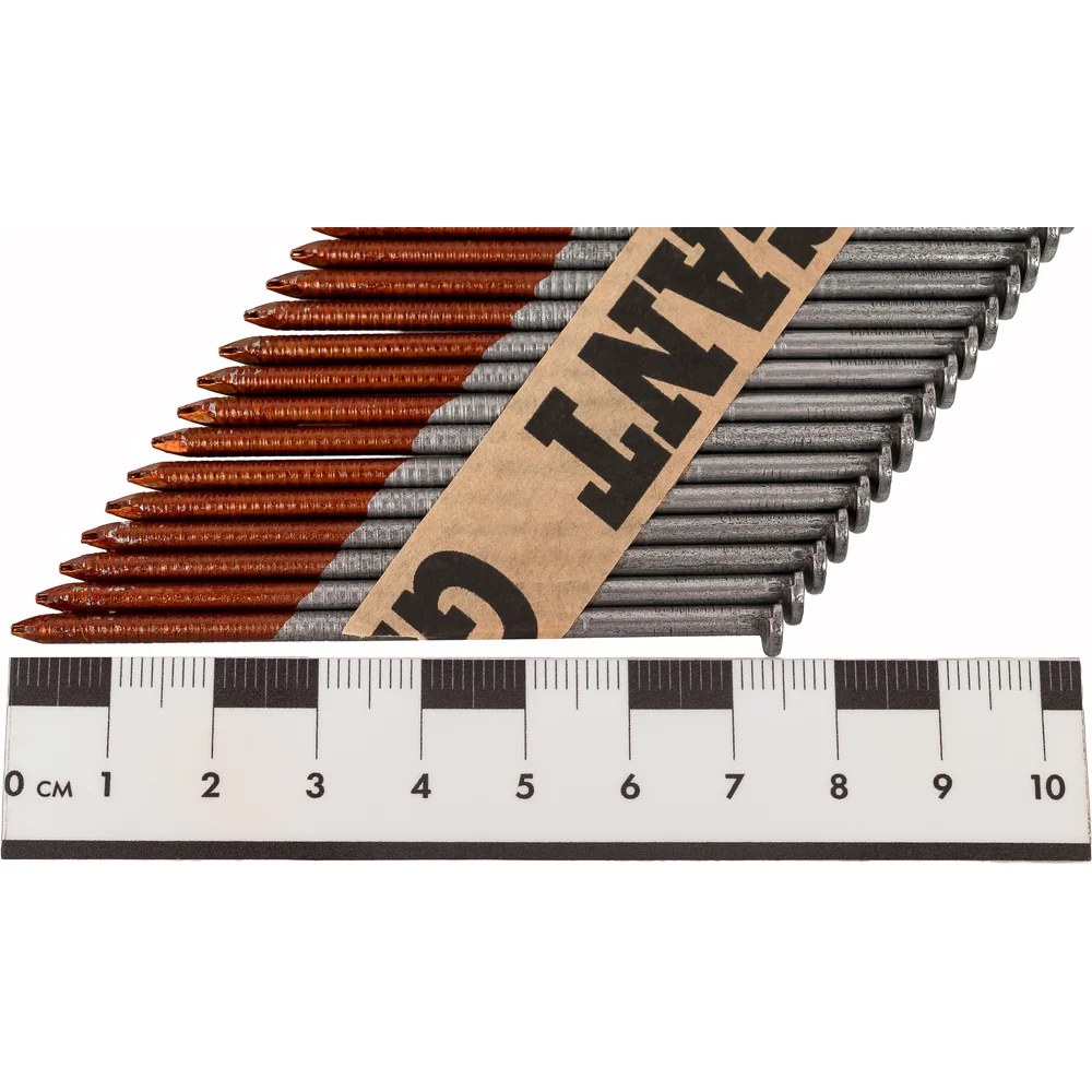 Реечный гвоздь по дереву Gigant GGR-75-3RZ используется в строительстве (сборке стропильных систем, деревянных каркасов), упаковочных работах и иных сферах. Рифленый стержень обеспечивает надежное сцепление с материалом, предотвращая выскальзывание. Упаковка из 2000 штук делает их экономичным выбором для крупных проектов. Расположены под углом 34 градуса, это позволяет не задевать шляпку соседнего гвоздя при монтаже и увеличивает срок службы пистолета. В комплекте 50 кассет на бумаге, в каждой кассете по 40 гвоздей. Могут использоваться с газовыми или аккумуляторными пистолетами большинства производителей, представленных на рынке (Hybest, Fubag, Зубр, Metabo и др.). Кольцевая накатка обеспечивает повышенное сцепление с древесиной. Бумажная основа и клей подобраны таким образом, что кассеты не разбиваются при падении, а при монтаже бумага полностью отделяется с гвоздем и не застревает в обойме.