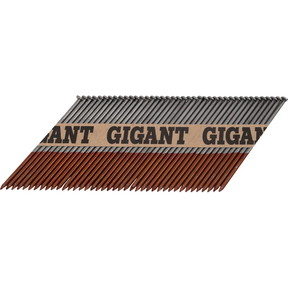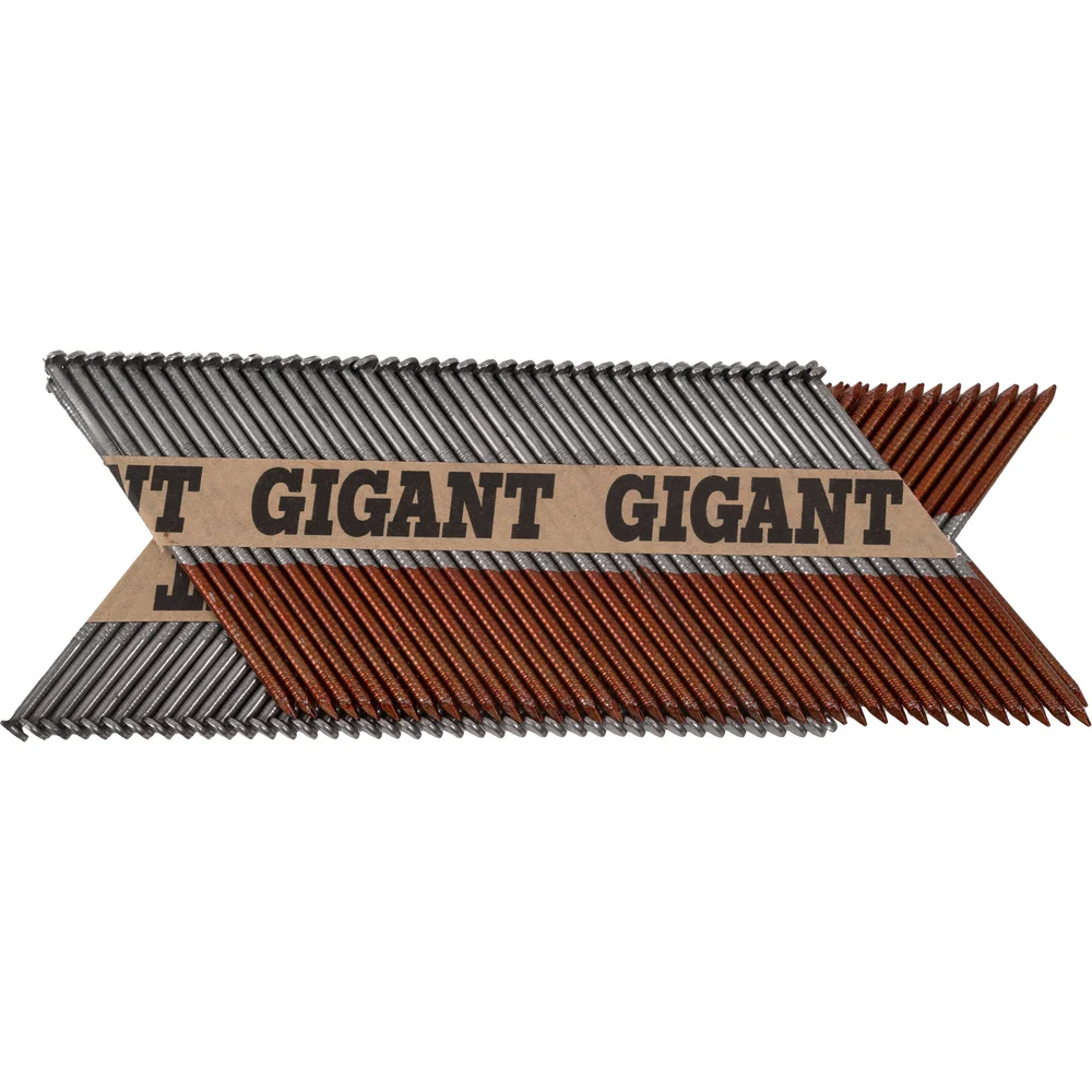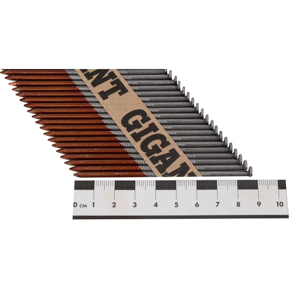 Реечный гвоздь по дереву Gigant GGR-90-3RZ используется в строительстве (сборке стропильных систем, деревянных каркасов), упаковочных работах и иных сферах. Рифленый стержень обеспечивает надежное сцепление с материалом, предотвращая выскальзывание. Упаковка из 2000 штук делает их экономичным выбором для крупных проектов. Расположены под углом 34 градуса, это позволяет не задевать шляпку соседнего гвоздя при монтаже и увеличивает срок службы пистолета. В комплекте 50 кассет на бумаге, в каждой кассете по 40 гвоздей. Могут использоваться с газовыми или аккумуляторными пистолетами большинства производителей, представленных на рынке (Hybest, Fubag, Зубр, Metabo и др.). Кольцевая накатка обеспечивает повышенное сцепление с древесиной. Бумажная основа и клей подобраны таким образом, что кассеты не разбиваются при падении, а при монтаже бумага полностью отделяется с гвоздем и не застревает в обойме.