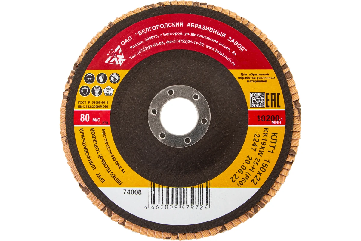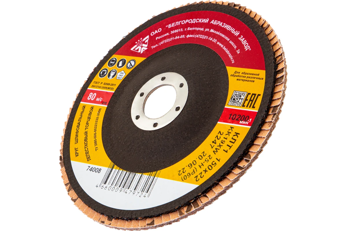 Круг лепестковый торцевой RUSSIA КЛТ-1, модель 74008, с зернистостью Р60 (25Н), диаметром 150 х 22,2 мм, предназначен для установки на фланец углошлифовальной машины (УШМ) с посадочным отверстием 22,2 мм. Этот инструмент подходит для выполнения черновой обработки, торцевого и плоского шлифования разнообразных материалов, включая древесину, металл и пластик. Он эффективно справляется с задачами по зачищению сварных швов, удалению острых углов после резки, толстой ржавчины и краски, а также снятию фасок.
