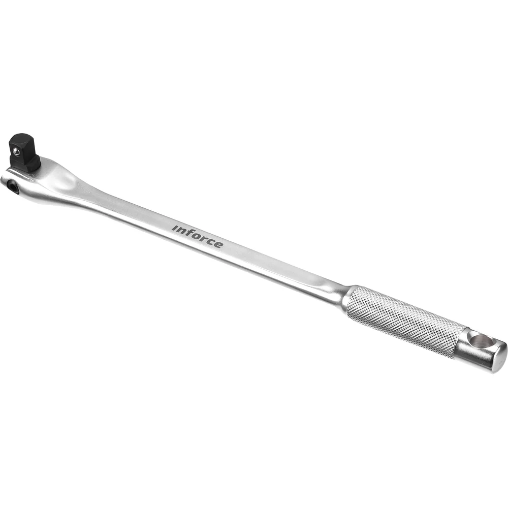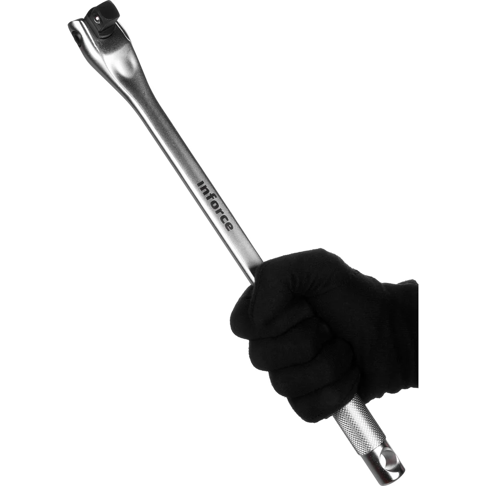Шарнирный вороток-кобра Inforce 1/2" 375 мм 06-05-109 оснащен ручкой из хромванадиевой стали. Она не подвержена коррозии. Квадрат с шарниром выполнен из ударопрочной стали для лучшей работы с крепежом. Специальные насечки и утолщение рукояти облегчают удержание инструмента и эффективность работы с винтами любого типа.