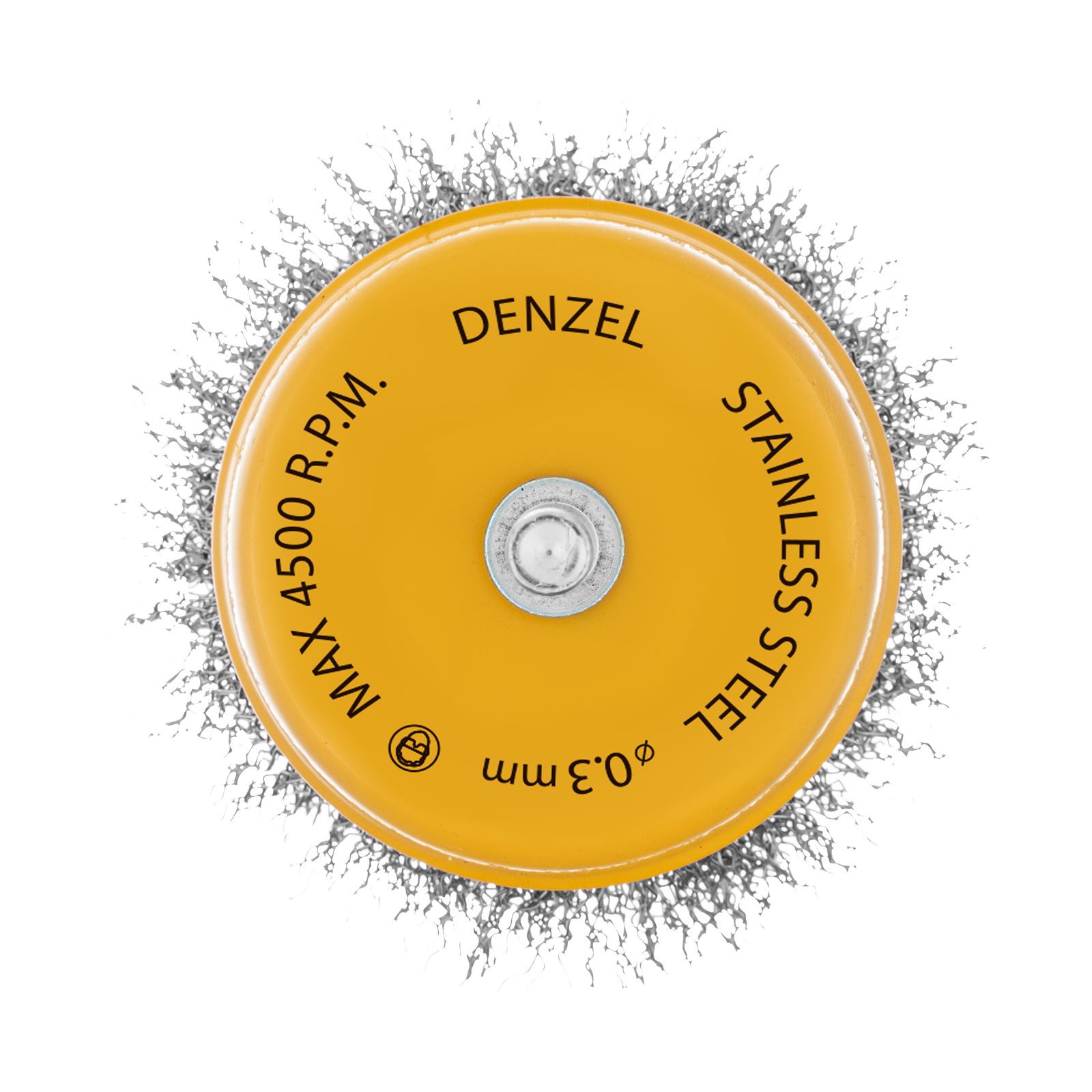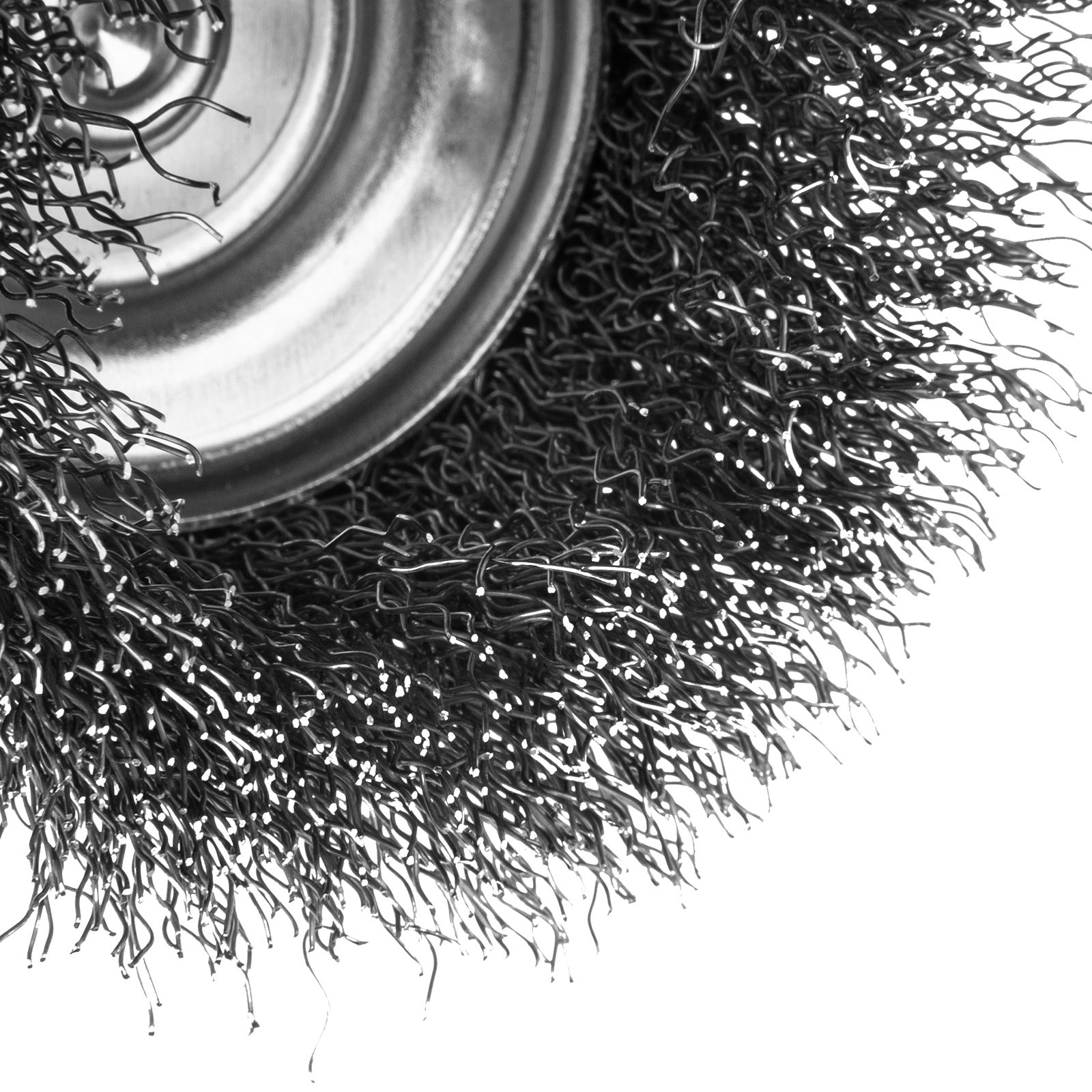 Щетка для дрели «Чашка» Denzel 744773 диаметром 75 мм, со шпилькой и щетиной из нержавеющей витой проволоки, используется для щадящей обработки плоских твердых поверхностей из металла, древесины, пластика, идеально подходит для нержавеющей стали. Оптимальна для снятия тонкого слоя старой краски, ржавчины, удаления загрязнений. Имеет хвостовик диаметром 6 мм и устанавливается в патрон дрели или прямошлифовальной машины (ПШМ).