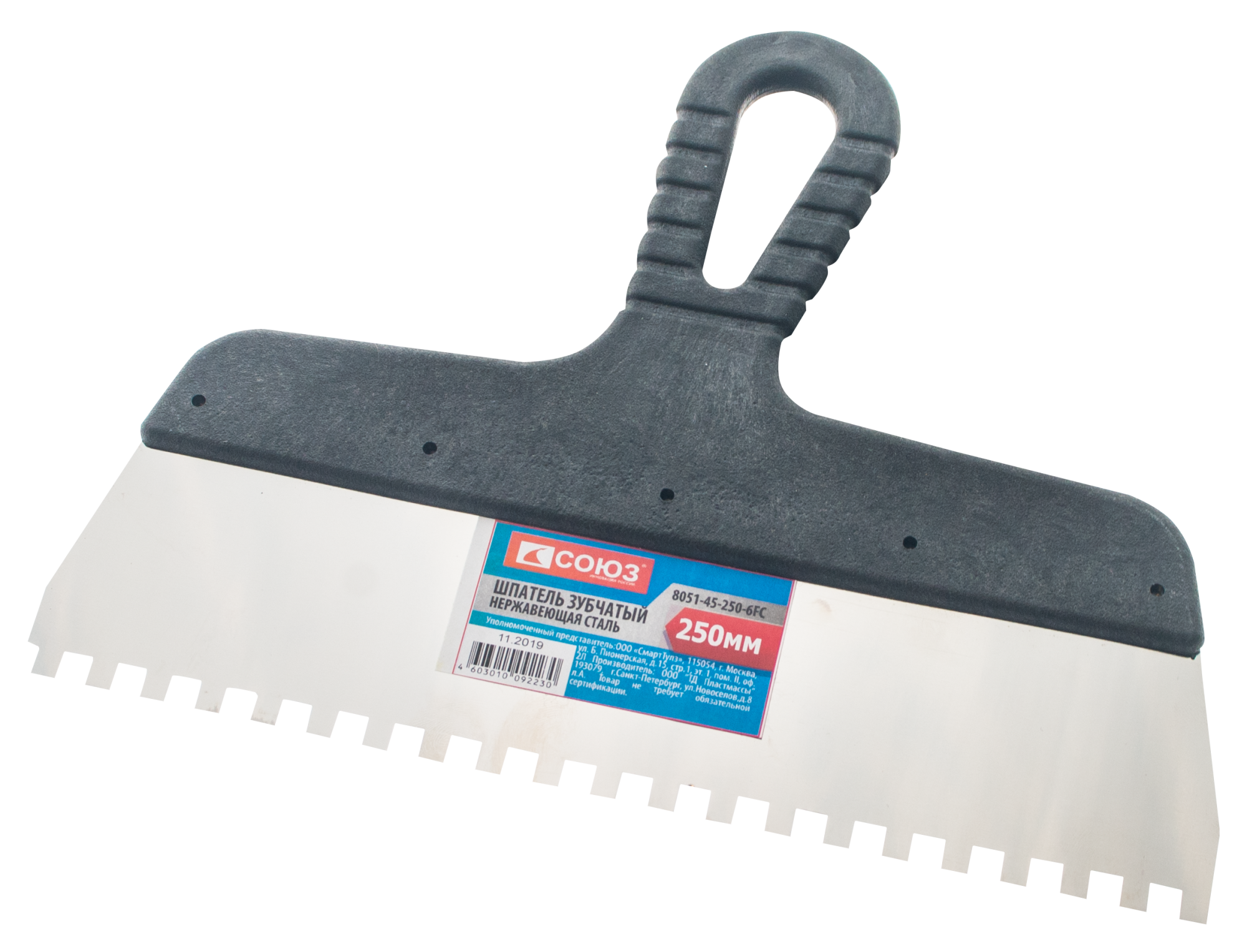Шпатель оснащен зубцами. Лезвие выполнено из нержавеющей стали.