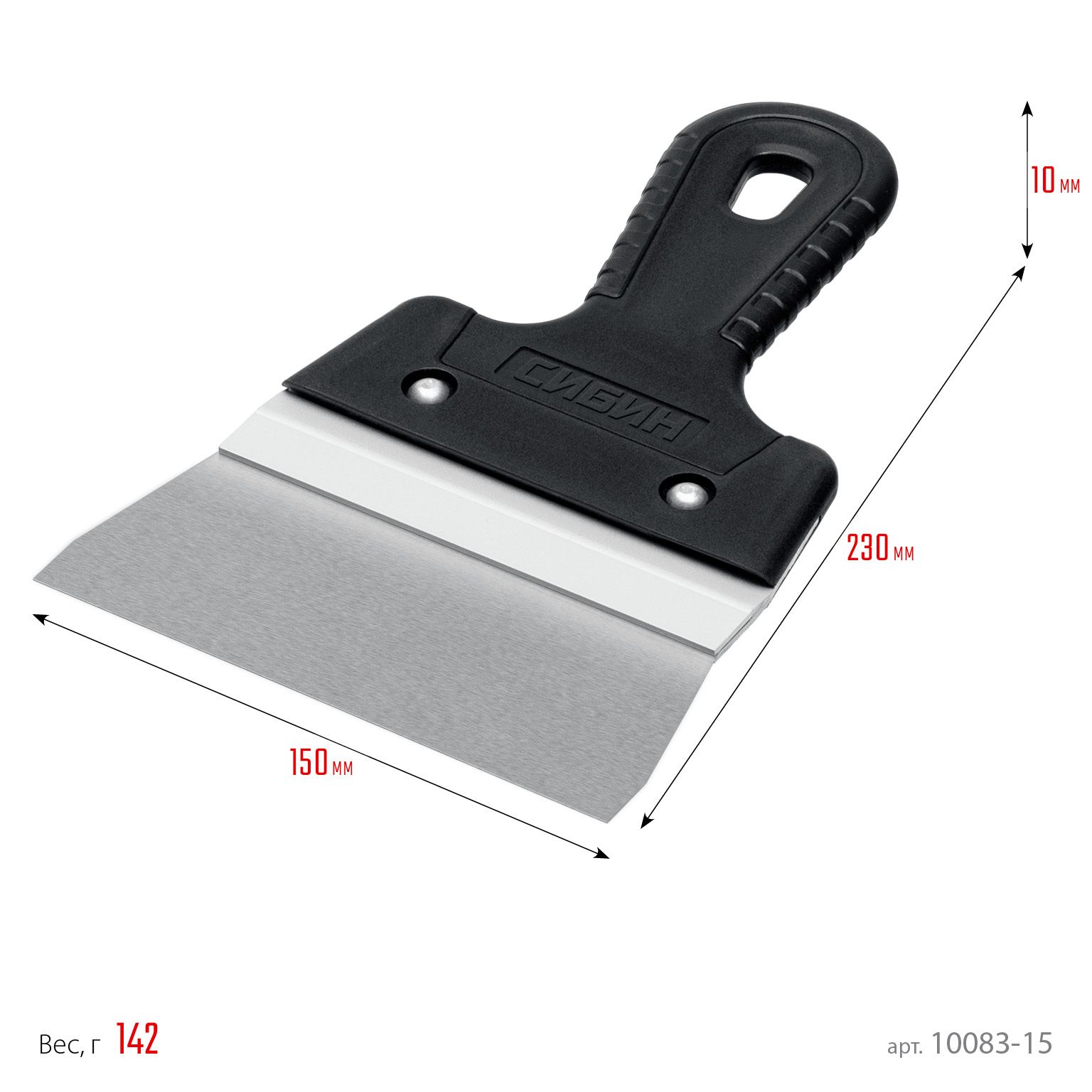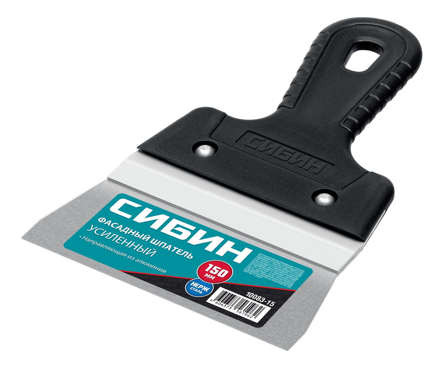 Шпатель СИБИН - отличный выбор для строительства и ремонта! Полотно из нержавеющей стали обеспечивает надежность и долгий срок службы инструмента, алюминиевая направляющая предотвращает изгиб полотна, а эргономичная однокомпонентная рукоятка создает условия для комфортной работы.