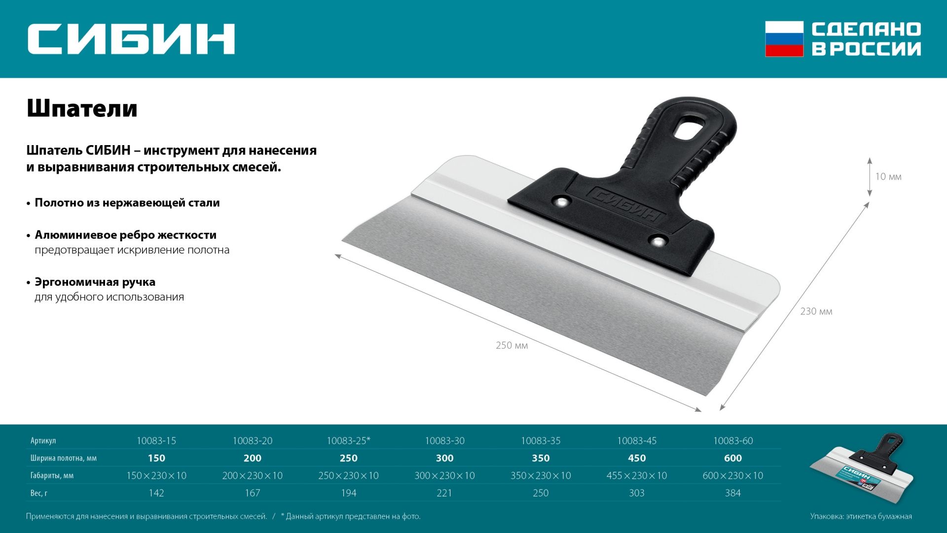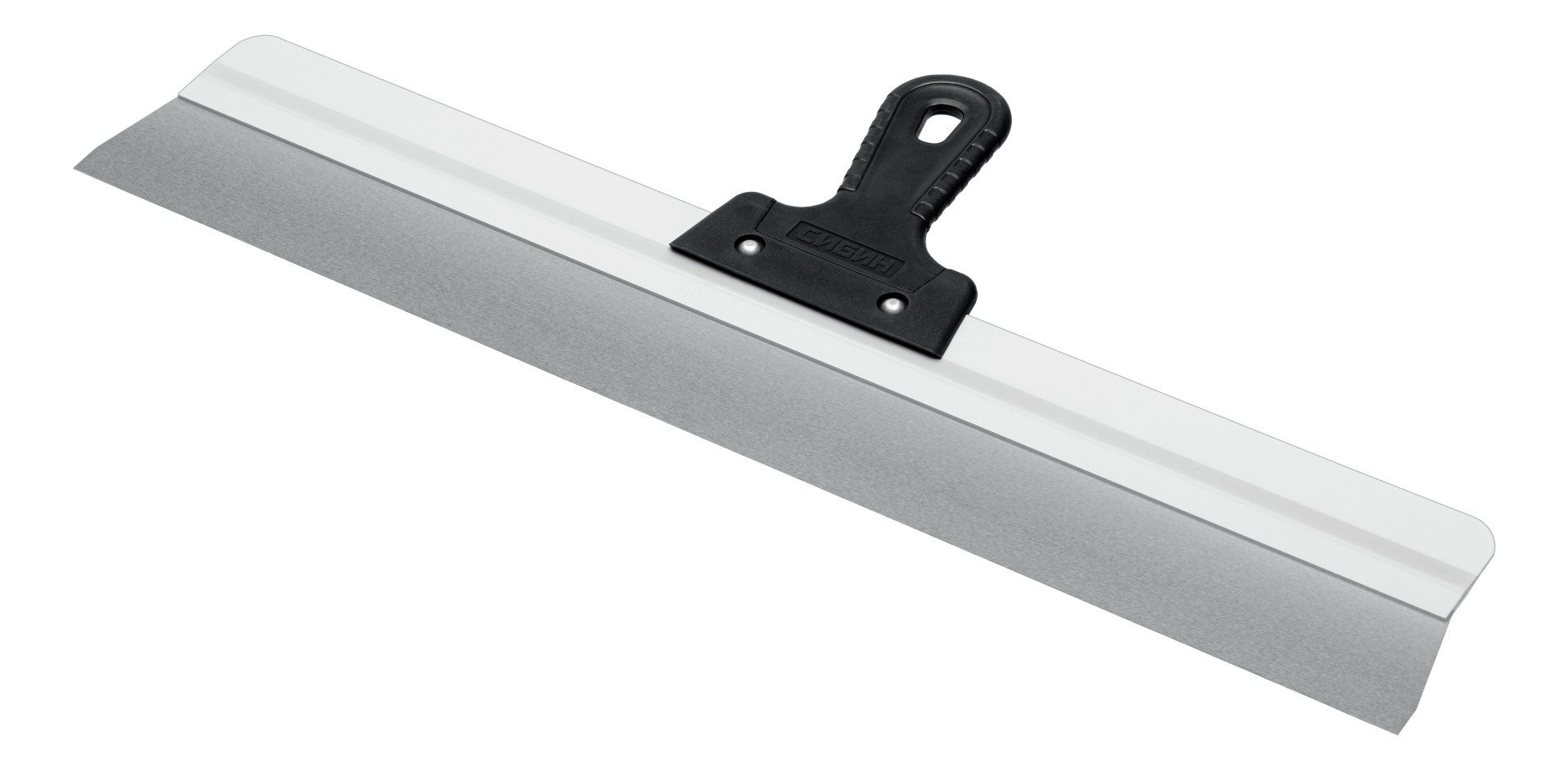 Шпатель СИБИН - отличный выбор для строительства и ремонта! Полотно из нержавеющей стали обеспечивает надежность и долгий срок службы инструмента, алюминиевая направляющая предотвращает изгиб полотна, а эргономичная однокомпонентная рукоятка создает условия для комфортной работы.