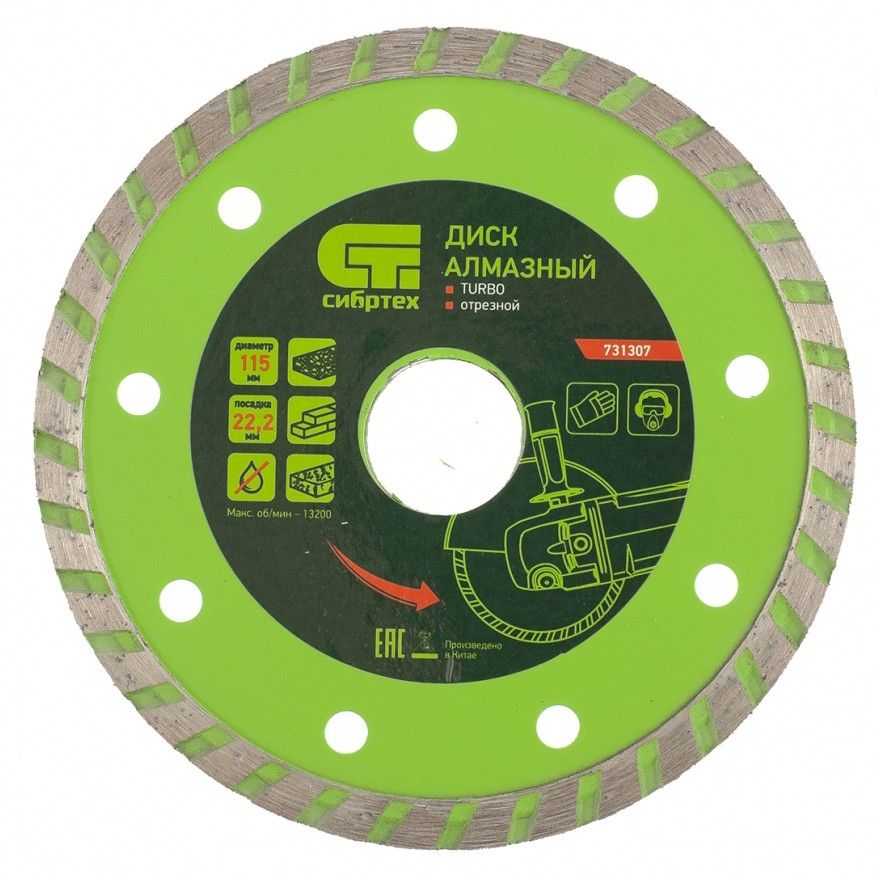 Алмазный отрезной диск Сибртех Turbo 731307 для сухой резки, 115 х 22,2 мм, устанавливается на углошлифовальные машинки и предназначен для использования в быту. Он позволяет резать твердые материалы — бетон, железобетон, камень, песчаник.