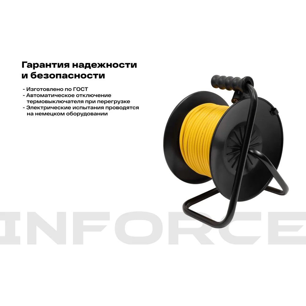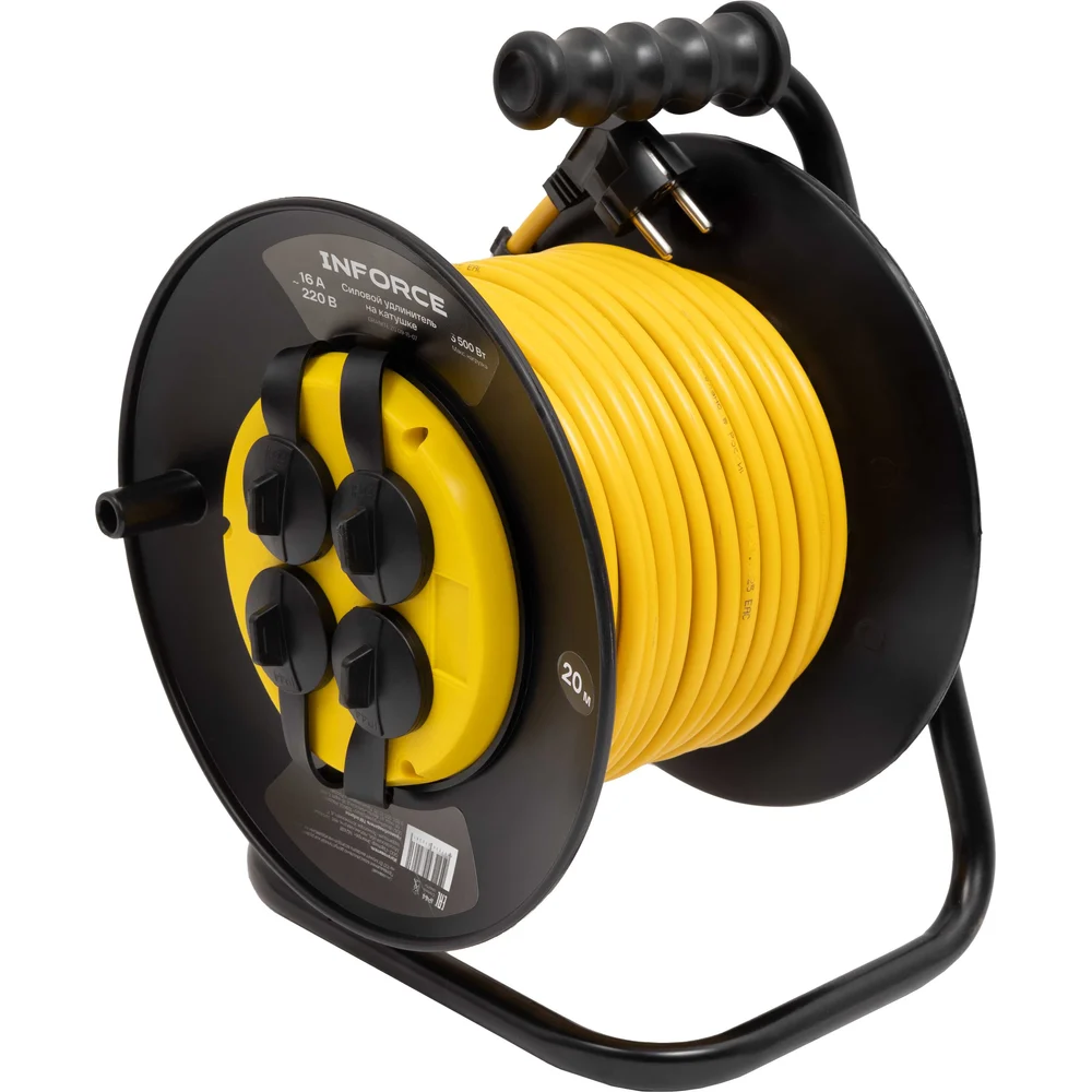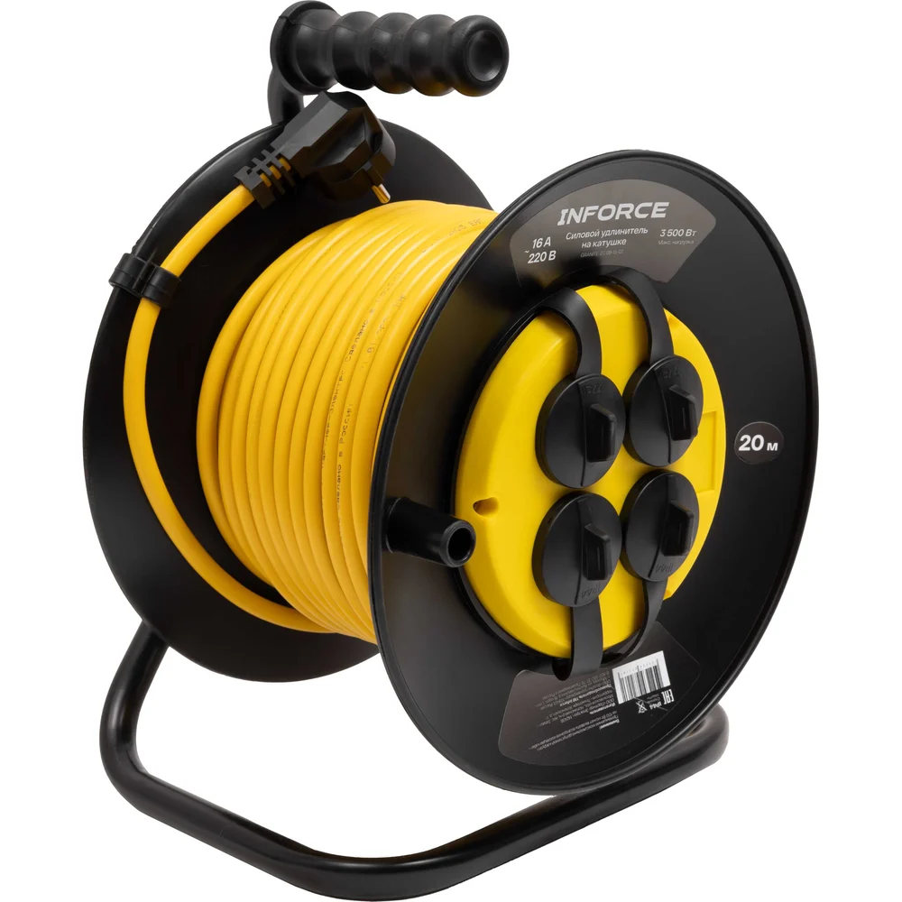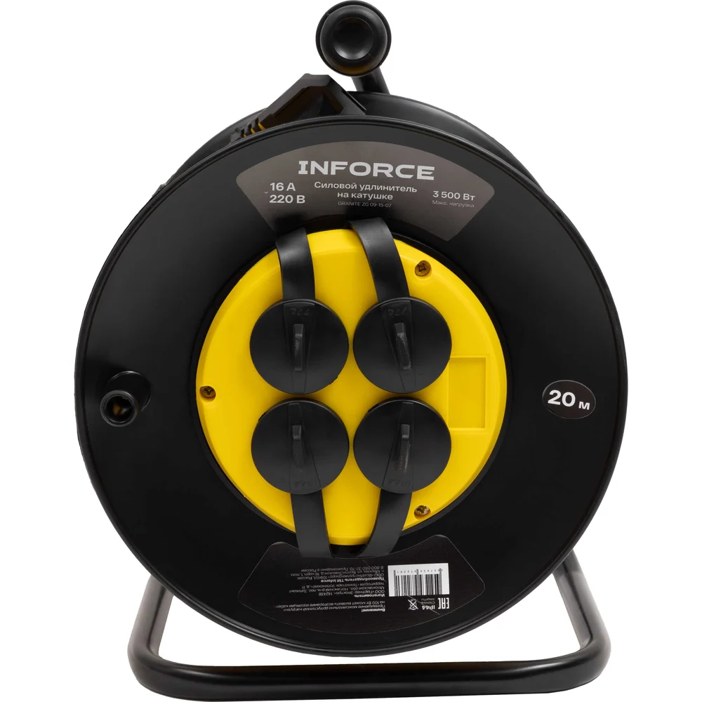 Силовой удлинитель Inforce на катушке, 4 гнезда, с/з ПВС 3х1,5 16A 20м IP44 GRANITE ZG 09-15-07 служит для подключения четырех приборов одновременно, которые находятся на удалении до 20 метров от основного источника сети. Кабель намотан на катушку из пластика. Конструкция оснащена устойчивой стальной стойкой и рукояткой для транспортировки. Кабель изготовлен по ГОСТ 31223-2012. Кабель типа ПВС с сечением 3х1,5 мм² обеспечивает долговечность и устойчивость к механическим повреждениям. Удлинитель имеет степень защиты IP44 и может эксплуатироваться при температуре от -5 до +40°С. Защитные крышки на розетках предохраняют от попадания пыли и влаги, продлевая срок службы удлинителя. Термовыключатель добавляет дополнительный уровень безопасности, предотвращая перегрев. Заземляющий кабель защищает от поражения электрическим током.