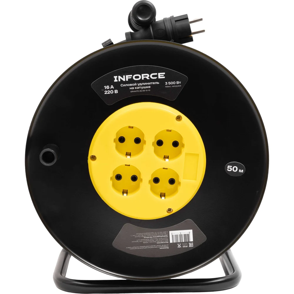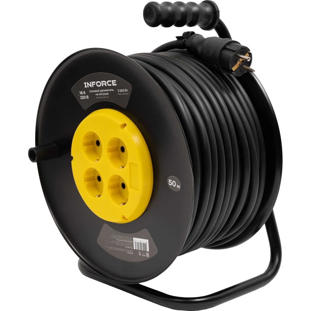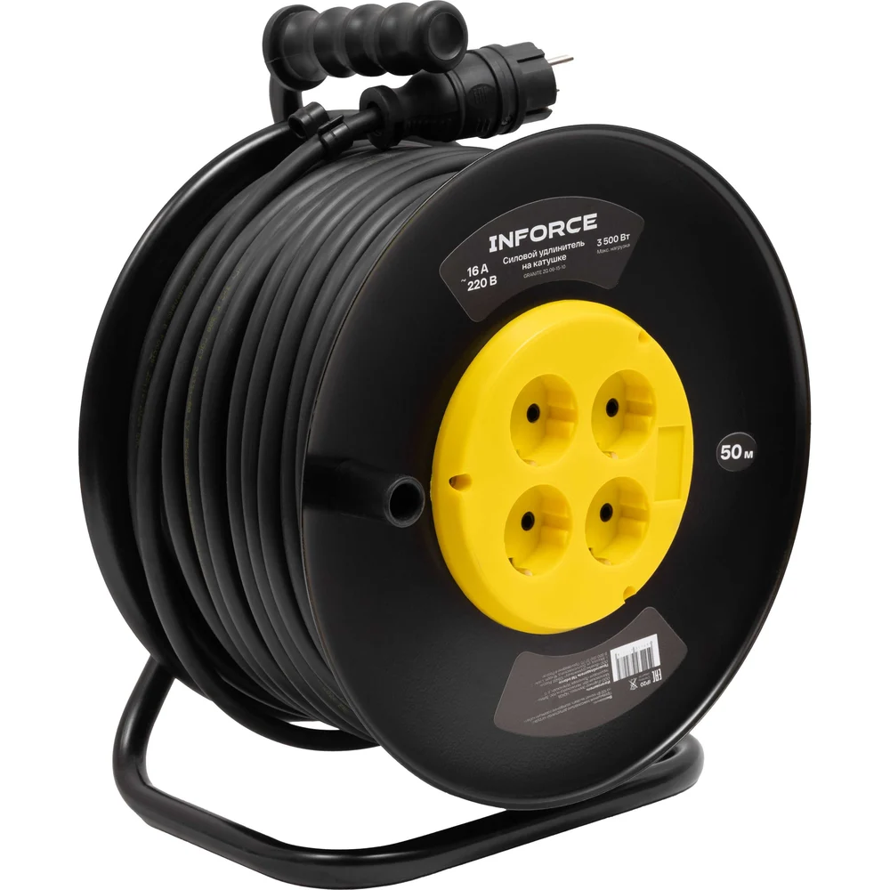 Силовой удлинитель Inforce 09-15-10 представляет собой надежное решение для удаленной работы, обеспечивая стабильное электропитание благодаря кабелю длиной 50 метров. Оснащенный четырьмя розетками с заземлением, он поддерживает напряжение сети 220 В и номинальную силу тока 16 А, что позволяет подключать устройства общей мощностью до 3500 Вт. Кабель изготовлен по ГОСТ 31223-2012. Морозостойкий кабель типа КГ с сечением 3х2,5 мм² обеспечивает долговечность и устойчивость к механическим повреждениям. Металлическая катушка обеспечивает прочность и устойчивость конструкции. Удлинитель имеет степень защиты IP20 и может эксплуатироваться при температуре от -60 до +40°С. Термовыключатель добавляет дополнительный уровень безопасности, предотвращая перегрев. Заземляющий кабель защищает от поражения электрическим током.