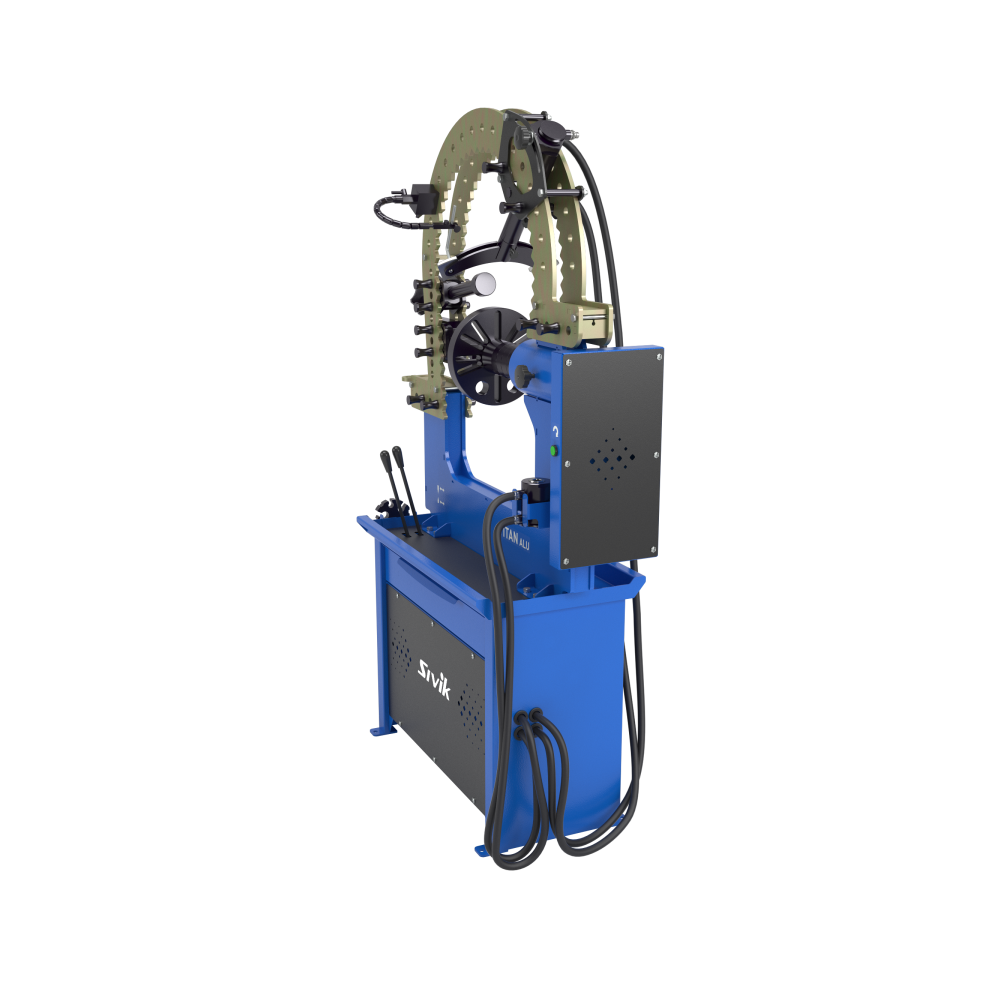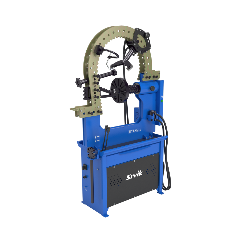 Стенд предназначен для правки любых повреждений легкосплавных литых и кованых дисков диаметром до 24” c электроприводом вала для просмотра биения поврежденного диска.